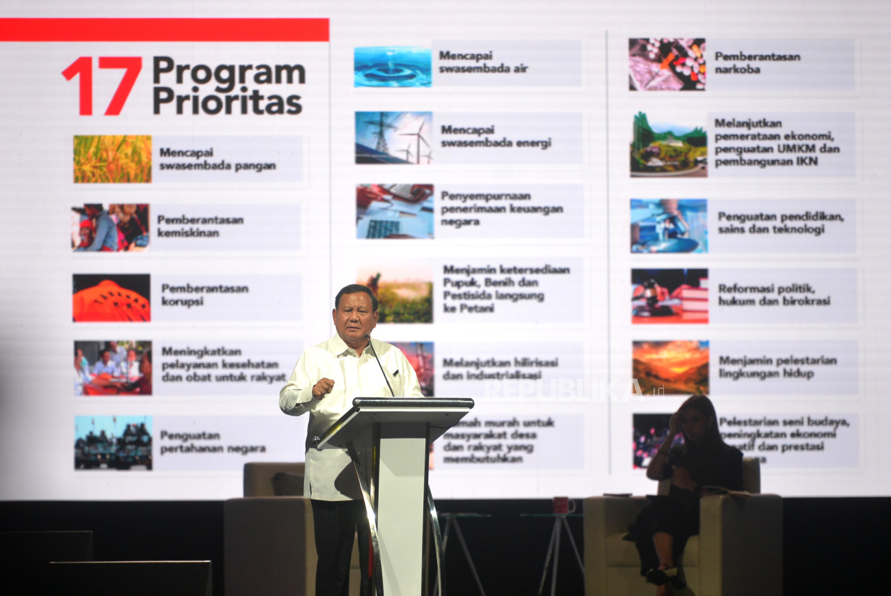 . Topik paling banyak dipilih yakni terkait Korupsi dan Penegakan Hukum, lapangan kerja, dan kebebasan berpendapat paling banyak disorot untuk Prabowo yang tampil pada sesi ketiga. Prabowo juga memaparkan tentang rencana jangka panjang Indonesia Emas yang | Republika/Wihdan Hidayat