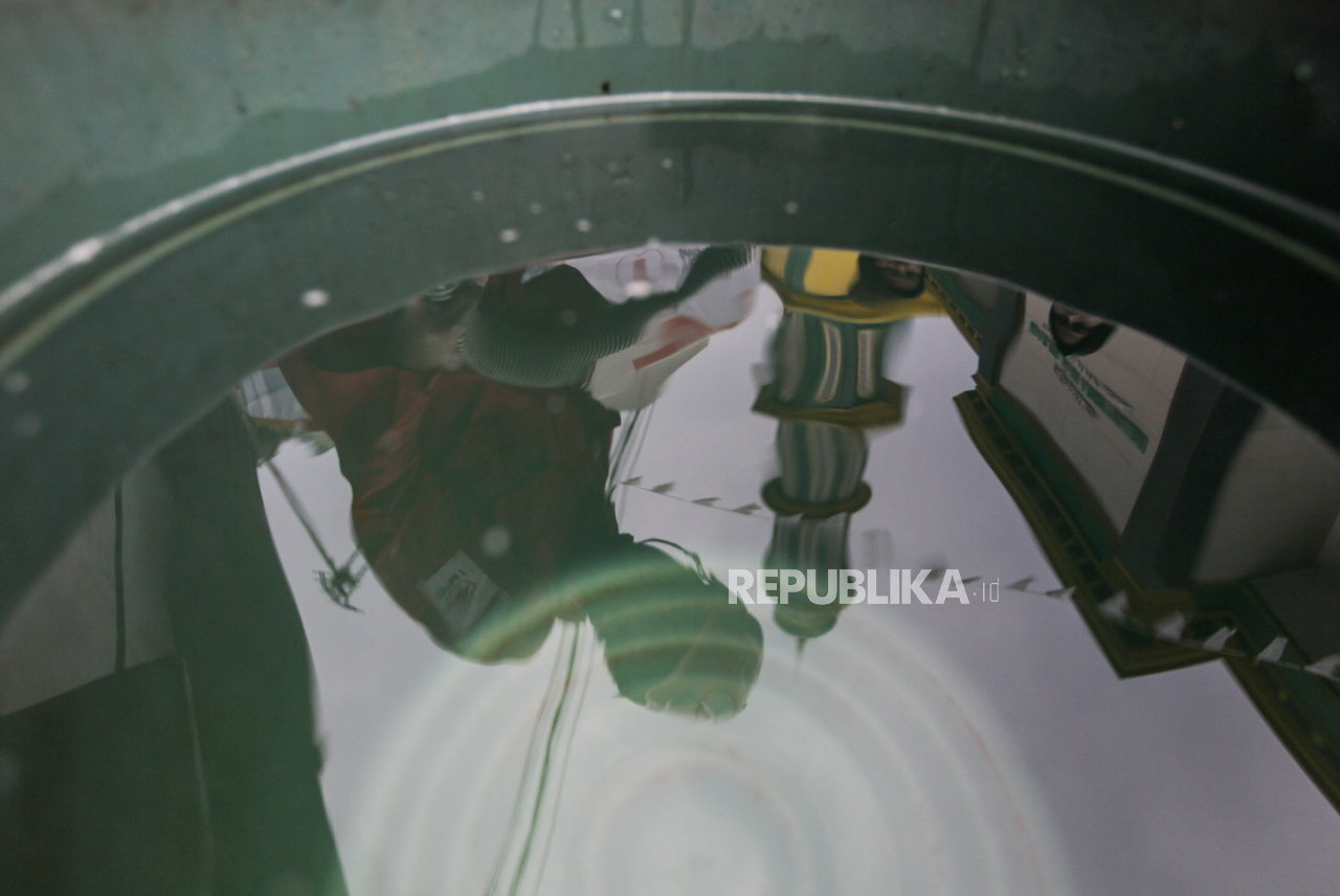 Refleksi petugas PMI Kota Depok mendistribusikan air bersih untuk warga di kawasan Cipayung, Kota Depok, Jawa Barat, Selasa (19/9/2023). | Republika/Putra M. Akbar