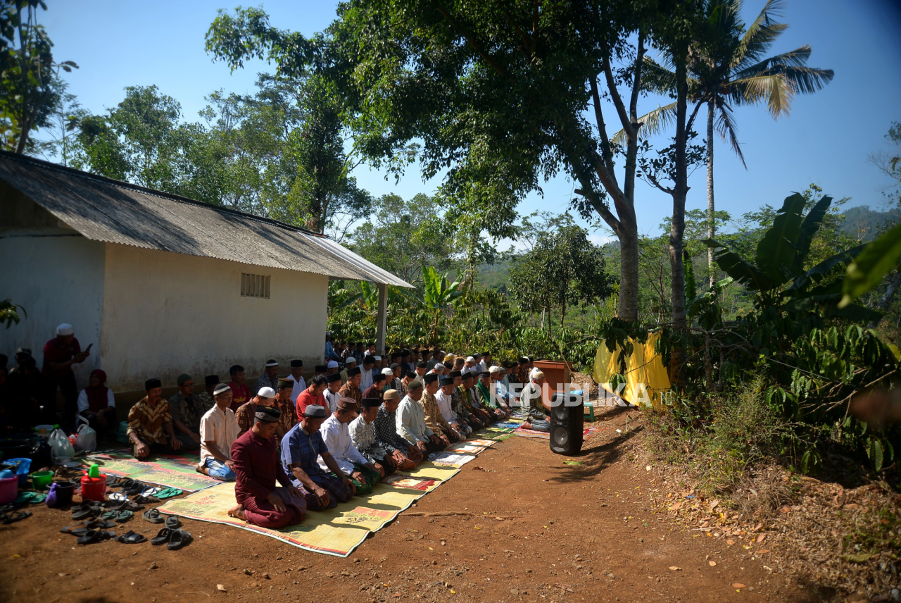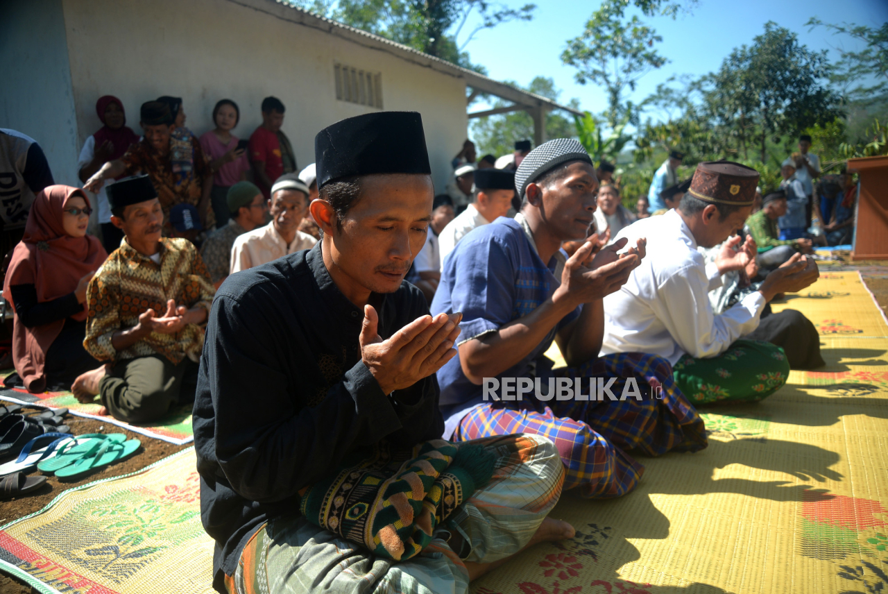 Warga berdoa bersama usai menunaikan Shalat Istisqa atau sholat meminta hujan di Desa Kemiriombo, Temanggung, Jawa Tengah, Jumat (6/10/2023). Warga Desa Kemiriombo sepakat untuk menggelar Shalat Istisqa imbas kemarau panjang tahun ini. Lokasi shalat di te | Republika/Wihdan Hidayat