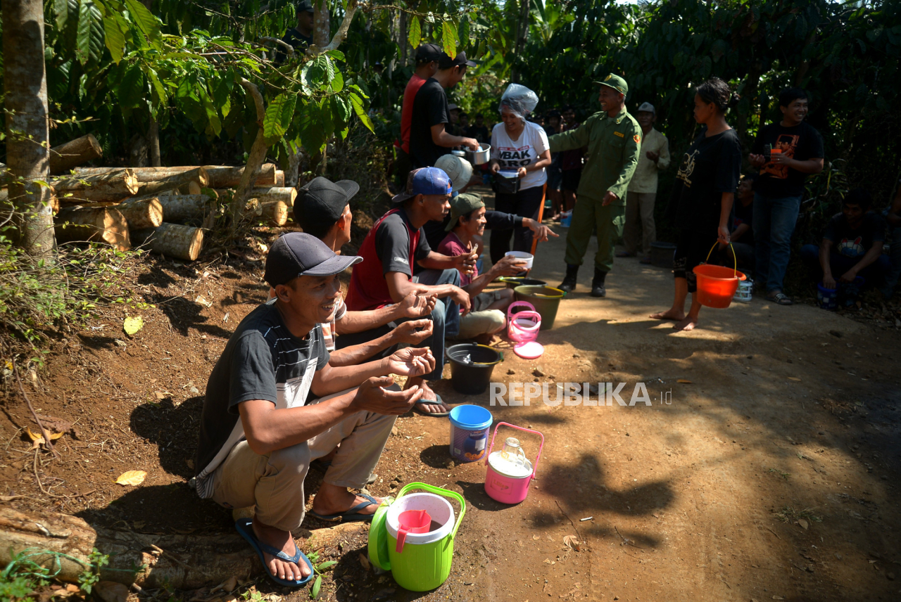 Warga pascaperang cendol usai pelaksanaan Shalat Istisqa atau sholat meminta hujan di Desa Kemiriombo, Temanggung, Jawa Tengah, Jumat (6/10/2023). Warga Desa Kemiriombo sepakat untuk menggelar Shalat Istisqa imbas kemarau panjang tahun ini. Lokasi shalat | Republika/Wihdan Hidayat