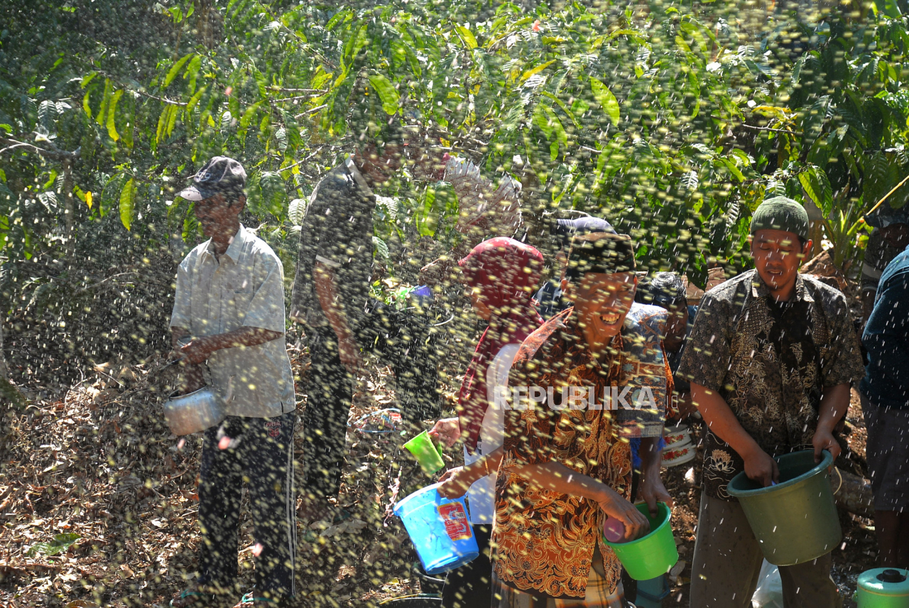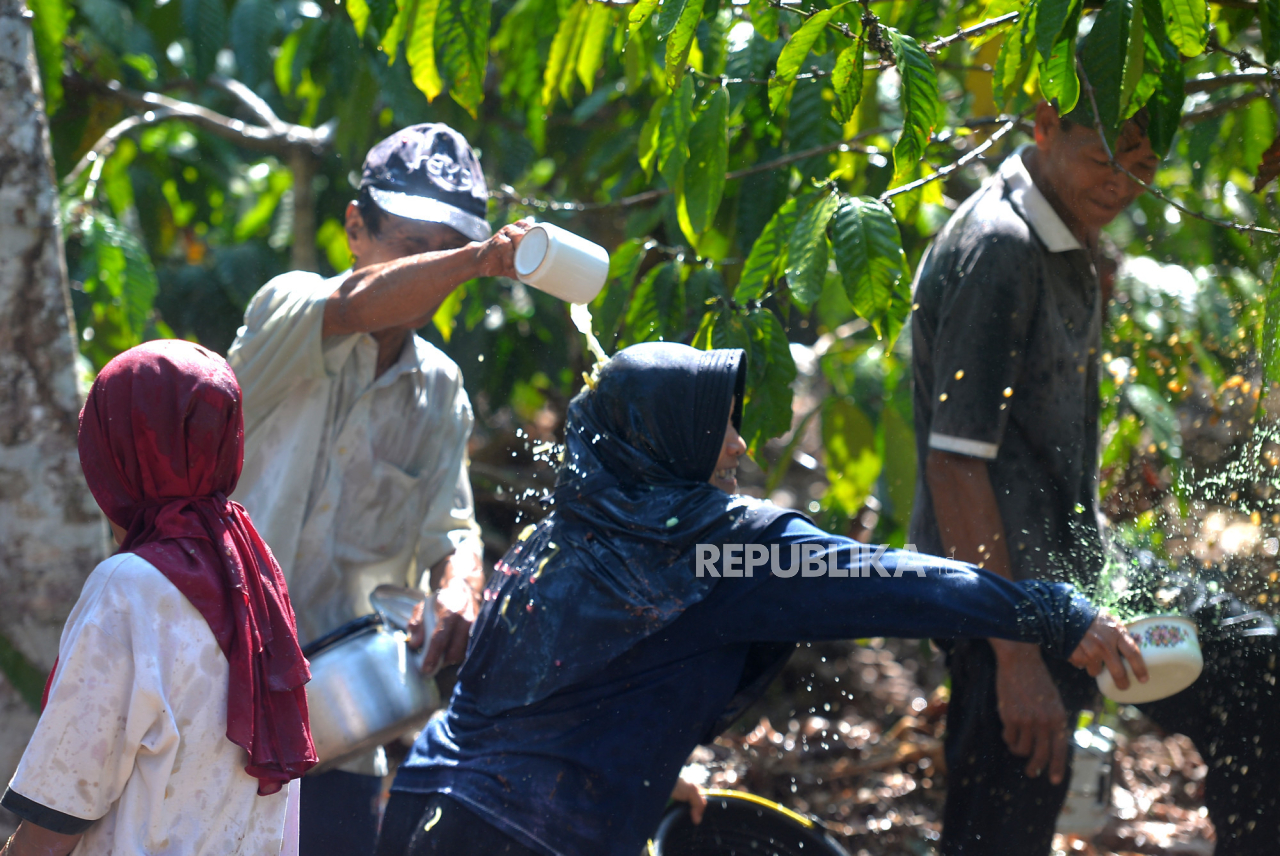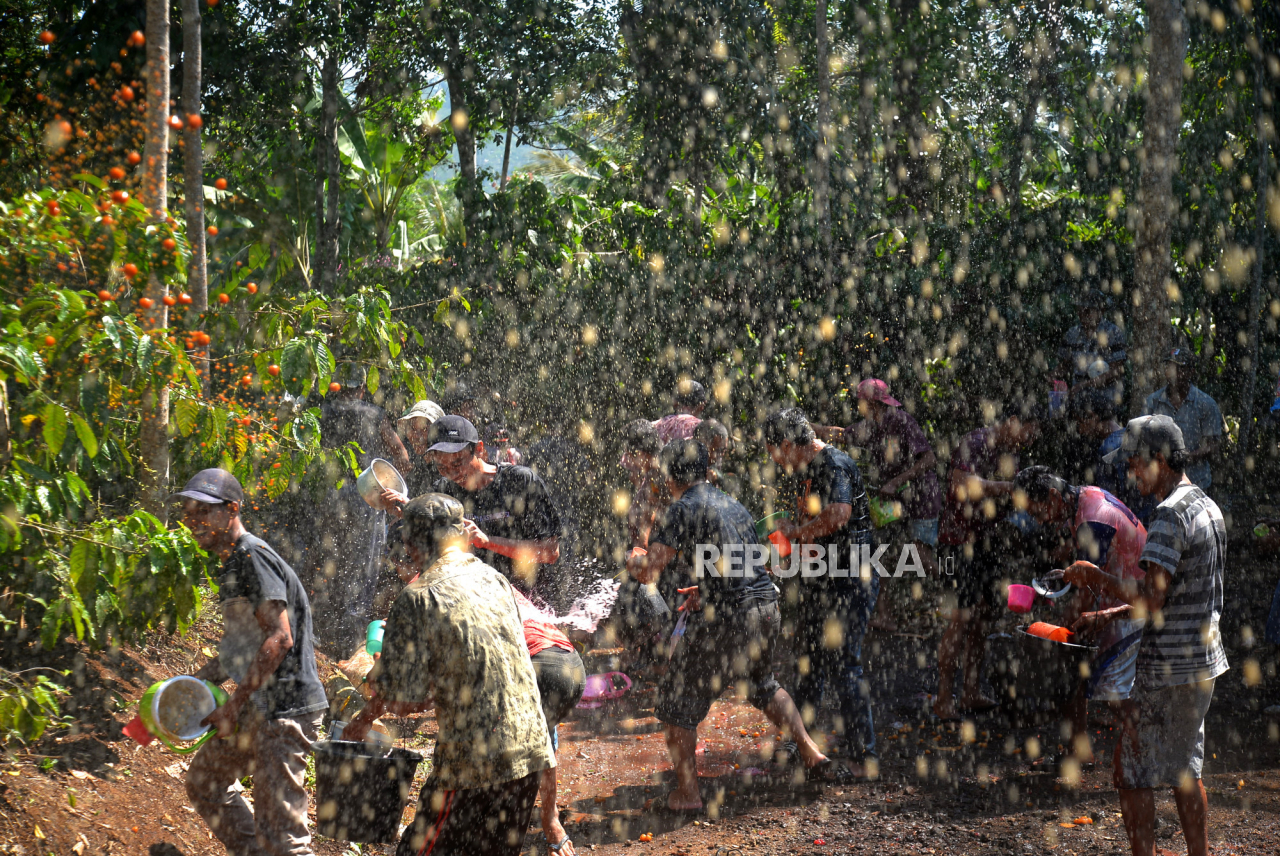Warga mulai perang cendol usai pelaksanaan Shalat Istisqa atau sholat meminta hujan di Desa Kemiriombo, Temanggung, Jawa Tengah, Jumat (6/10/2023). Warga Desa Kemiriombo sepakat untuk menggelar Shalat Istisqa imbas kemarau panjang tahun ini. Lokasi shalat | Republika/Wihdan Hidayat