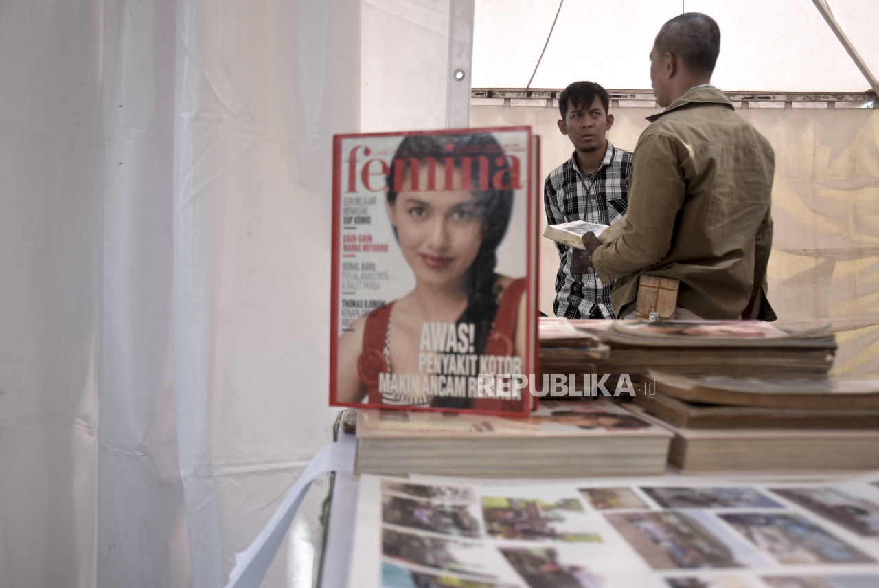 Pengunjung berada di stan majalah lawas pada Museum Monpera Expo di halaman Monumen Perjuangan Rakyat Jawa Barat, Kota Bandung, Jawa Barat, Selasa (31/10/2023). | ABDAN SYAKURA/REPUBLIKA