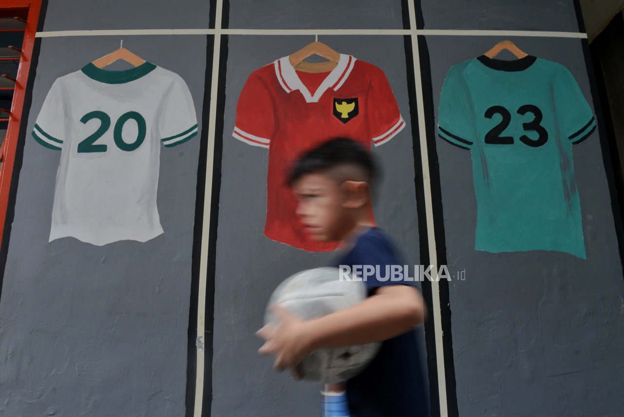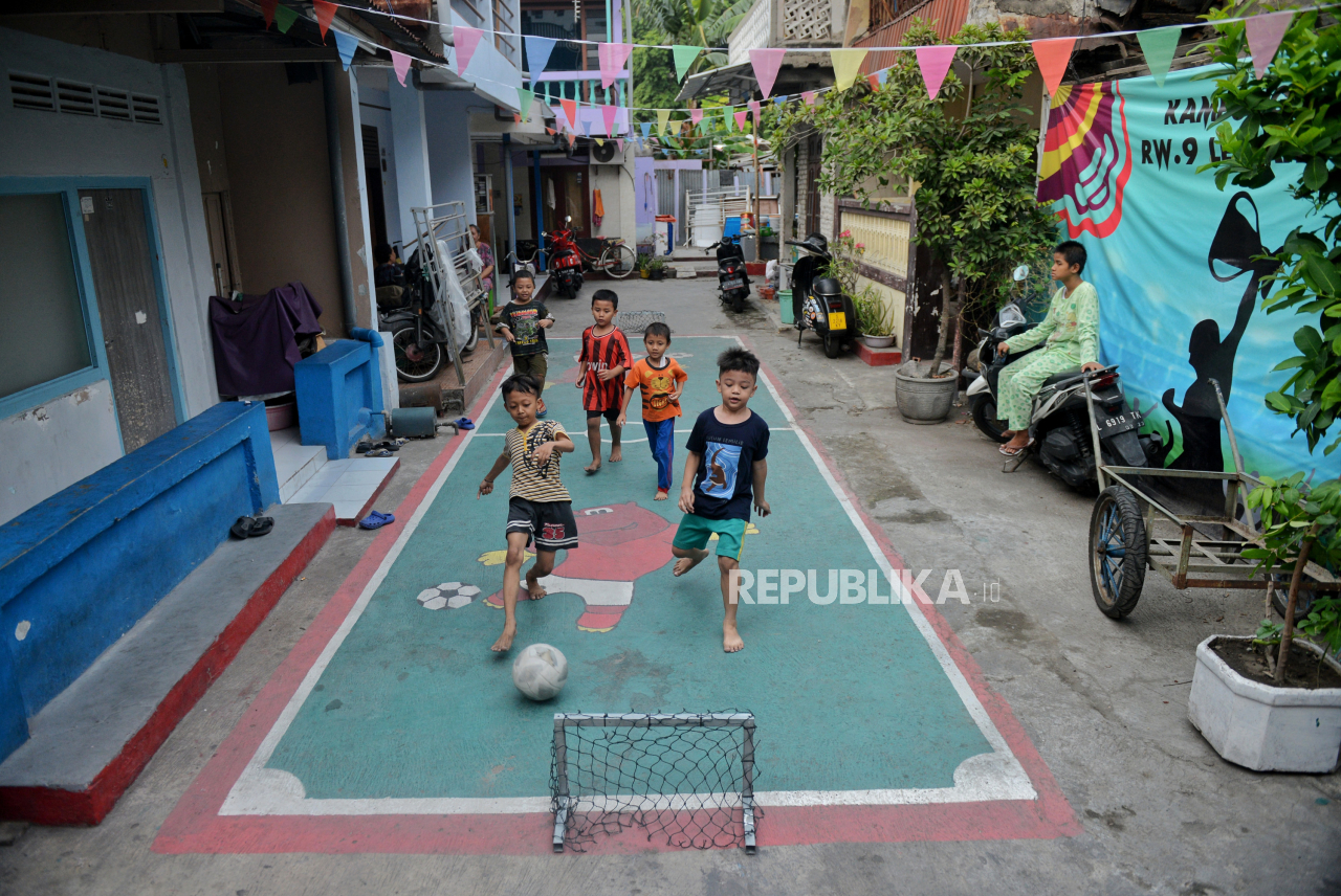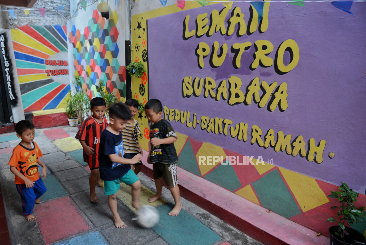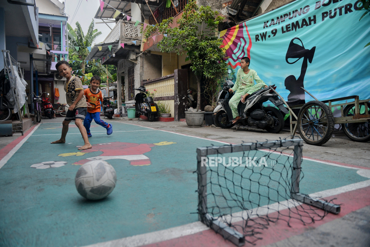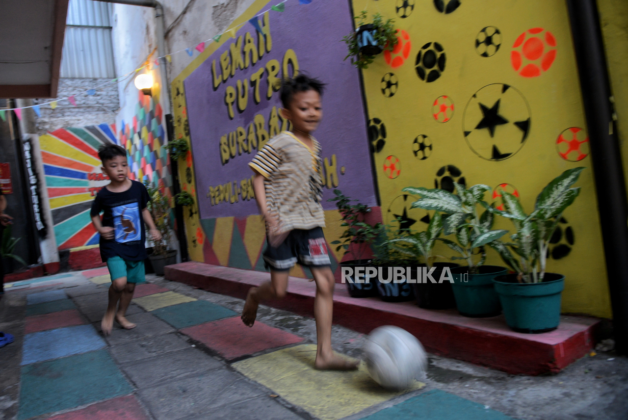 Anak-anak bermain bola di Kampung Lemah Putro RW 09, Embong Kaliasin, Kecamatan Genteng, Kota Surabaya, Jawa Timur, Sabtu (11/11/2023). Kampung Lemah Putro tersebut dihiasi dengan mural tematik Piala Dunia seperti bendera peserta, gambar maskot Bacuya, da | Republika/Thoudy Badai