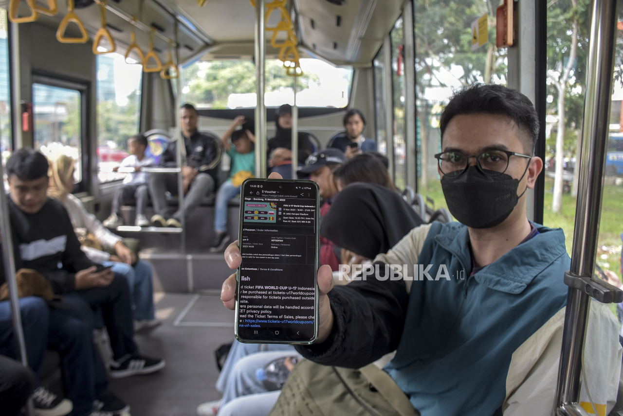 Calon penonton pertandingan Piala Dunia U17 menunjukkan tiket daring saat berada di dalam shuttle bus di Dome Bale Rame Sabilulungan, Kabupaten Bandung, Jawa Barat, Sabtu (11/11/2023). | REPUBLIKA/ABDAN SYAKURA