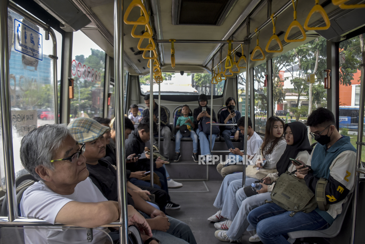 Calon penonton pertandingan Piala Dunia U17 berada di dalam shuttle bus di Dome Bale Rame Sabilulungan, Kabupaten Bandung, Jawa Barat, Sabtu (11/11/2023). | REPUBLIKA/ABDAN SYAKURA