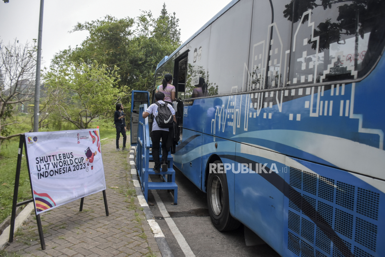 Calon penonton pertandingan Piala Dunia U17 menaiki shuttle bus di Dome Bale Rame Sabilulungan, Kabupaten Bandung, Jawa Barat, Sabtu (11/11/2023). | REPUBLIKA/ABDAN SYAKURA