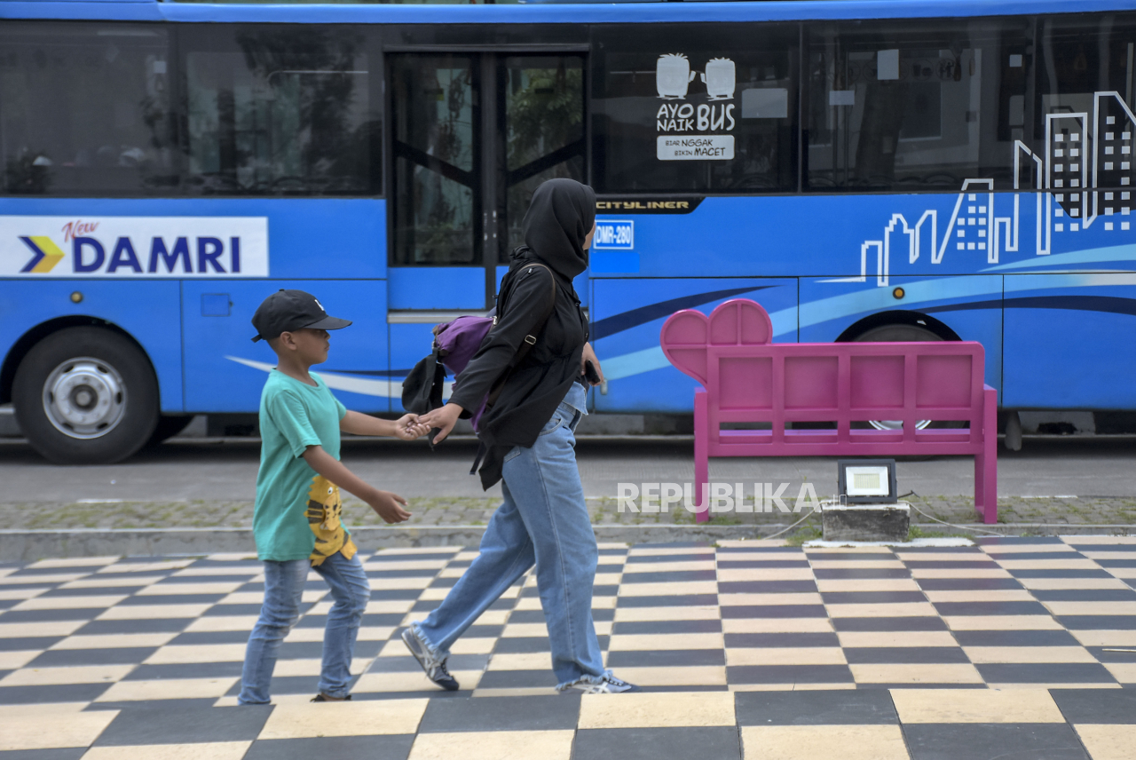 Calon penonton pertandingan Piala Dunia U17 melintas di samping shuttle bus di Dome Bale Rame Sabilulungan, Kabupaten Bandung, Jawa Barat, Sabtu (11/11/2023). | REPUBLIKA/ABDAN SYAKURA