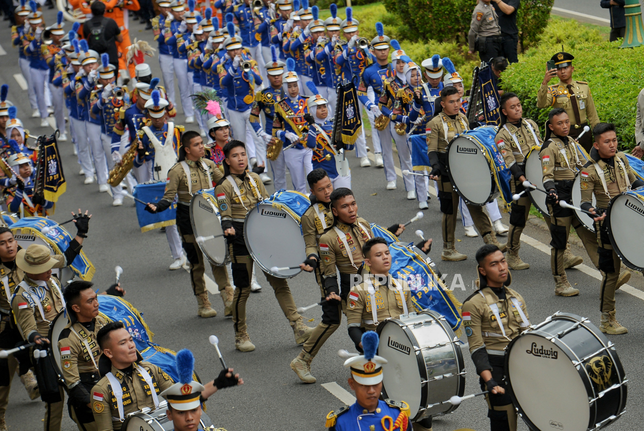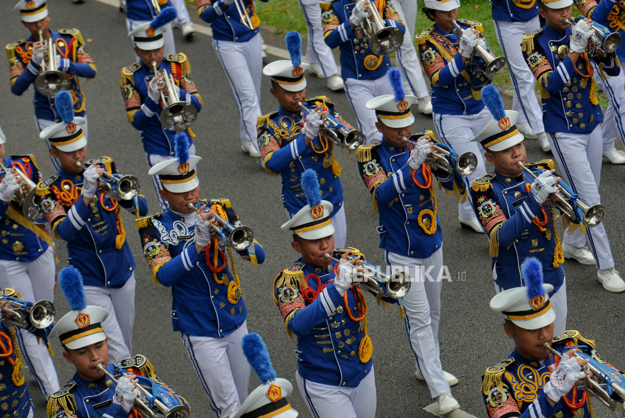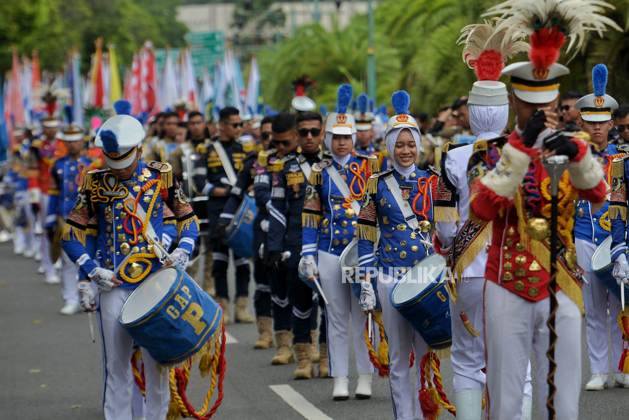 Grup marching band beserta petugas Komisi Pemilihan Umum (KPU) menggelar defile kirab bendera peserta Pemilu 2024 dari Jalan imam Bonjol menuju gedung KPU, Jakarta, Senin (27/11/2023). Kirab 18 bendera parpol peserta Pemilu 2024 tersebut dilakukan dalam r | Republika/Thoudy Badai