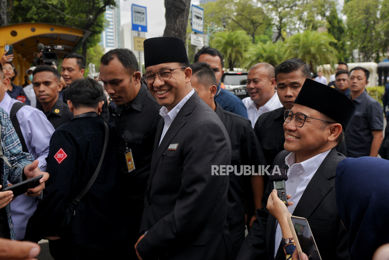Pasangan capres dan cawapres nomor urut 1 Anies Baswedan dan Muhaimin Iskandar tiba untuk menghadiri acara Deklarasi Kampanye Pemilu Damai di kantor Komisi Pemilihan Umum (KPU), Jakarta, Senin (27/11/2023). | Republika/Thoudy Badai