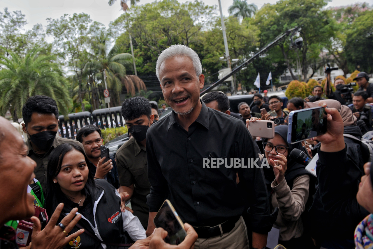 Capres nomor urut 3 Ganjar Pranowo menjawab pertanyaan jurnalis saat menghadiri acara Deklarasi Kampanye Pemilu Damai di kantor Komisi Pemilihan Umum, Jakarta, Senin (27/11/2023). | Republika/Thoudy Badai