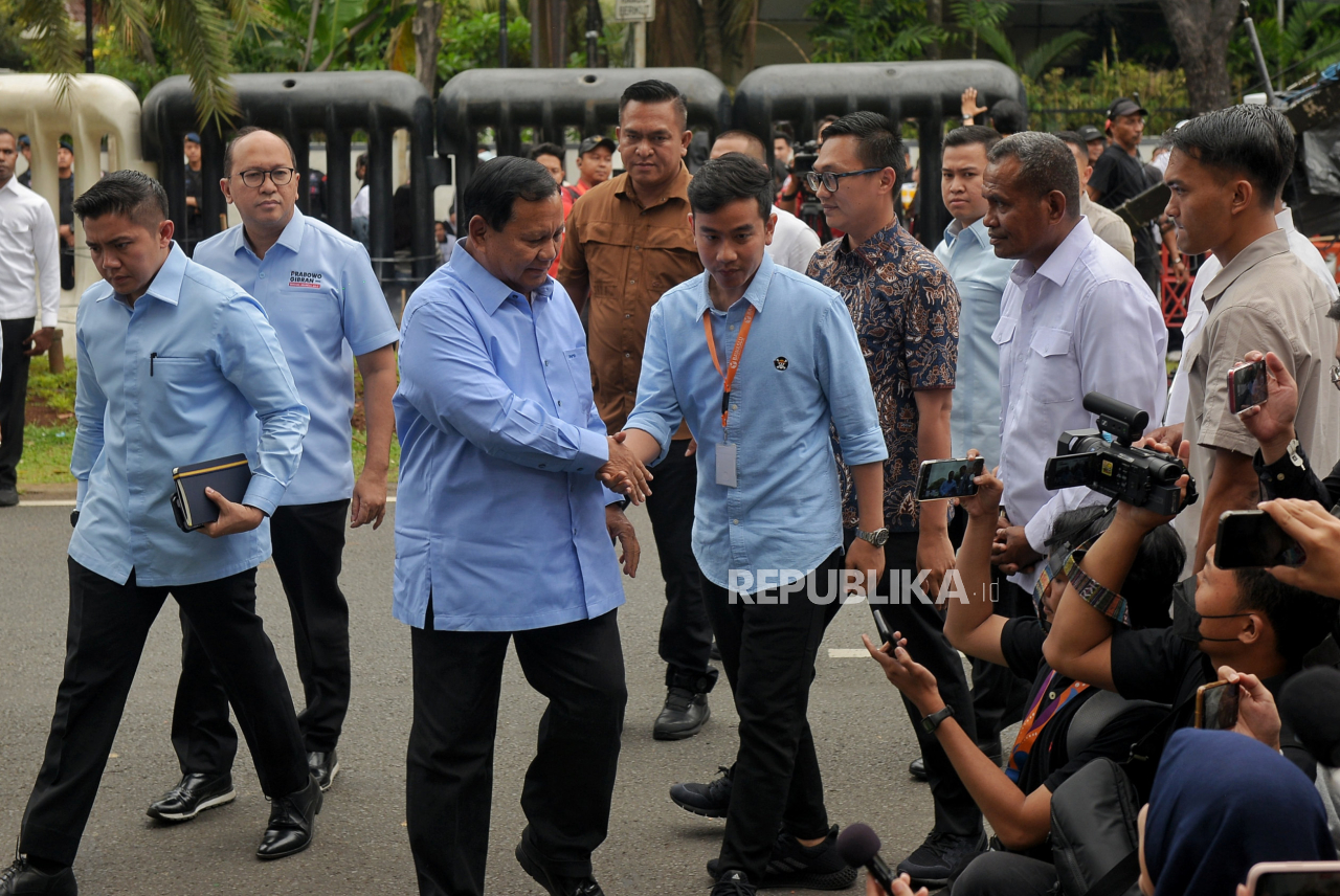 Pasangan capres dan cawapres nomor urut 2 Prabowo Subianto dan Gibran Rakabuming Raka tiba untuk menghadiri acara Deklarasi Kampanye Pemilu Damai di kantor Komisi Pemilihan Umum, Jakarta, Senin (27/11/2023). | Republika/Thoudy Badai