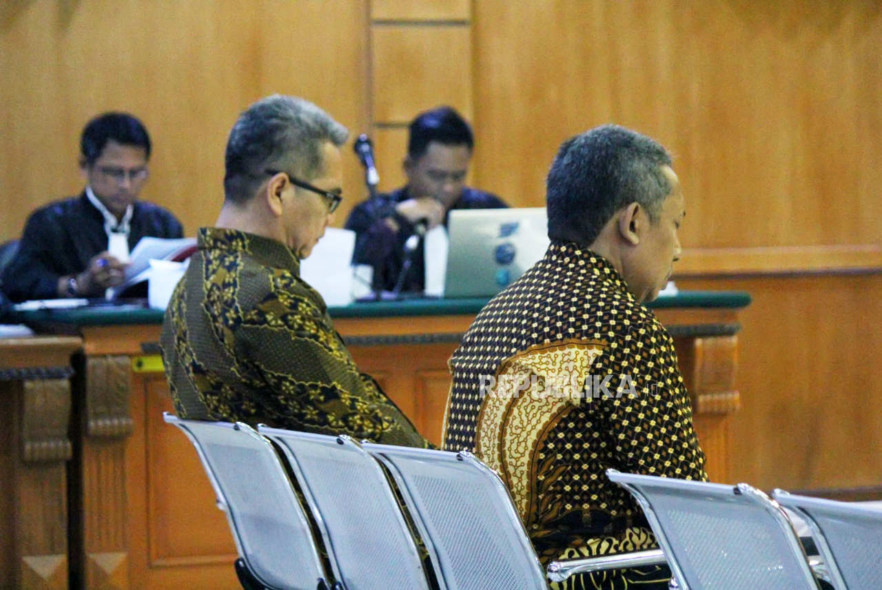 Terdakwa kasus pengadaan CCTV dan penyedia jasa internet proyek Bandung Smart City, Dadang Darmawan (kiri), dan Yana Mulyana (kanan) mengikuti sidang tuntutan di Pegadilan Negeri (PN) Bandung. | Edi Yusuf/Republika