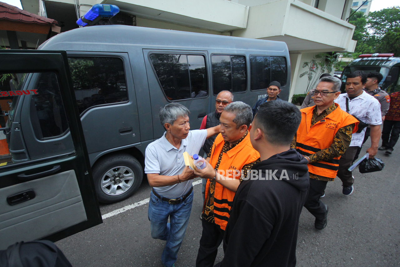 Terdakwa kasus pengadaan CCTV dan penyedia jasa internet proyek Bandung Smart City, Yana Mulyana dan Darmawan, menuju mobil tahanan usai menjalani sidang tuntutan di Pegadilan Negeri (PN) Bandung/ | Edi Yusuf/Republika