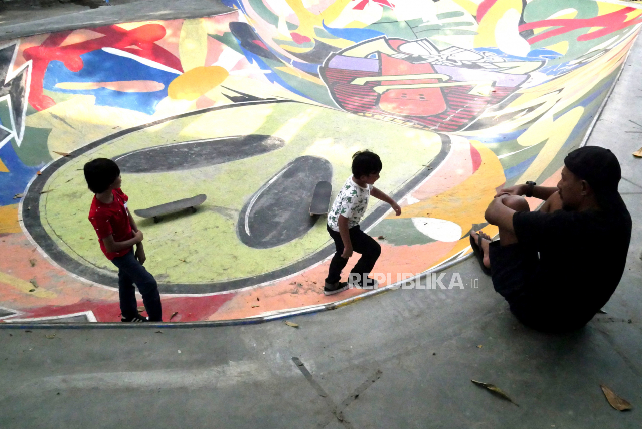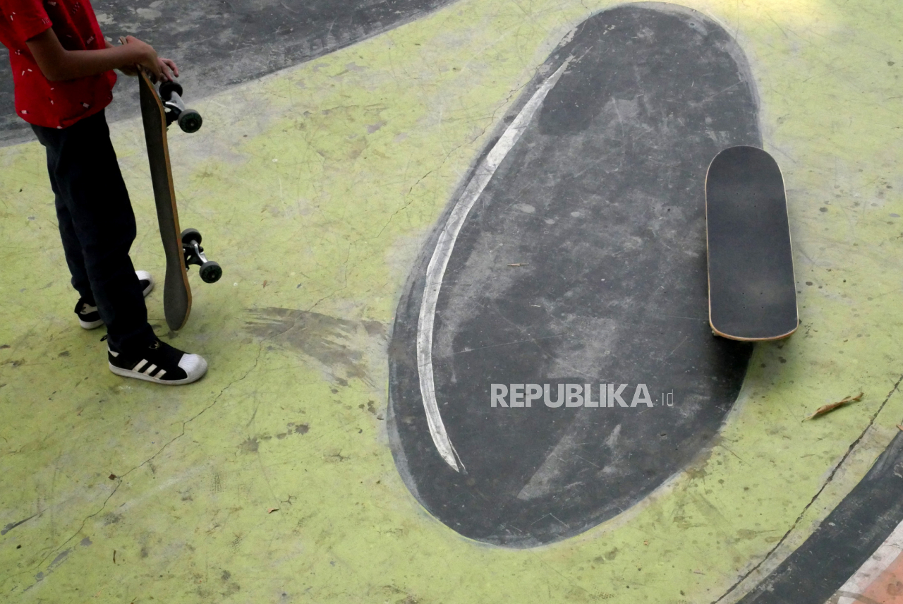 Anak-anak bermain skateboard di Pasty Skatebowl, Yogyakarta, Jumat (18/9). Selama sekolah menggunakan sistem daring, banyak anak-anak memanfaatkan waktu sore di Pastyly Skatebowl | Wihdan Hidayat / Republika