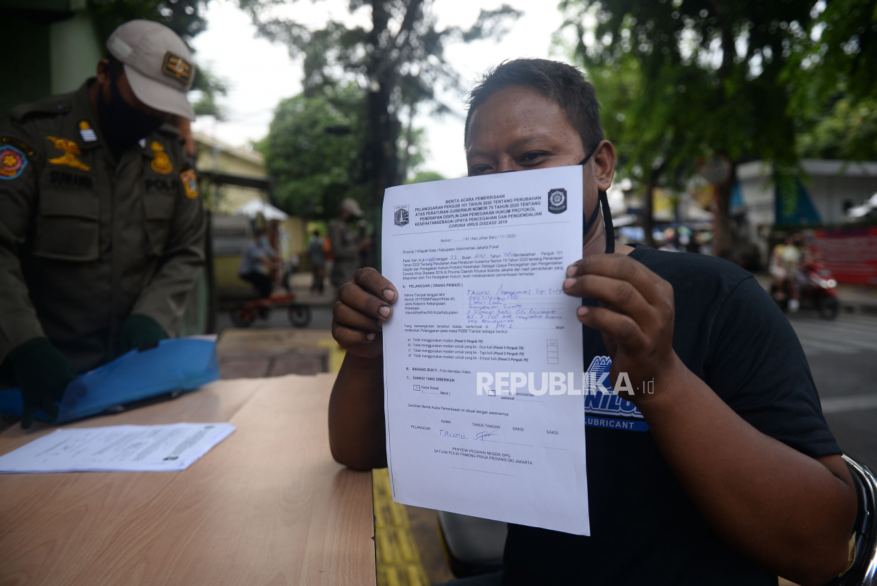 Warga yang kedapatan tidak menggunakan masker menunjukan dokumen pelanggaran dalam operasi yustisi protokol kesehatan Covid-19 di Kawasan Johar Baru, Jakarta, Ahad (22/11). Dalam oprasi tersebut sebanyak 20 warga menjalani hukuman kerja sosial karena abai | Prayogi/Republika