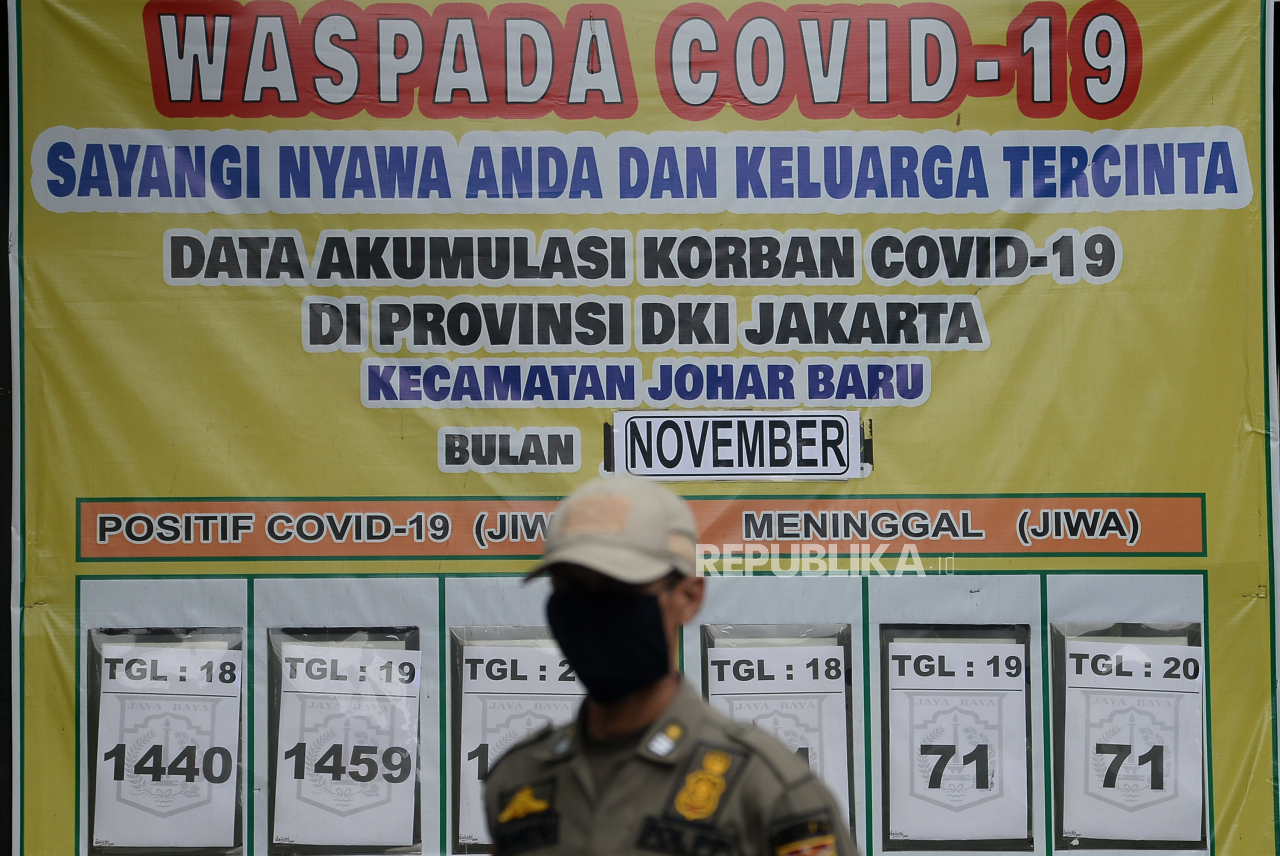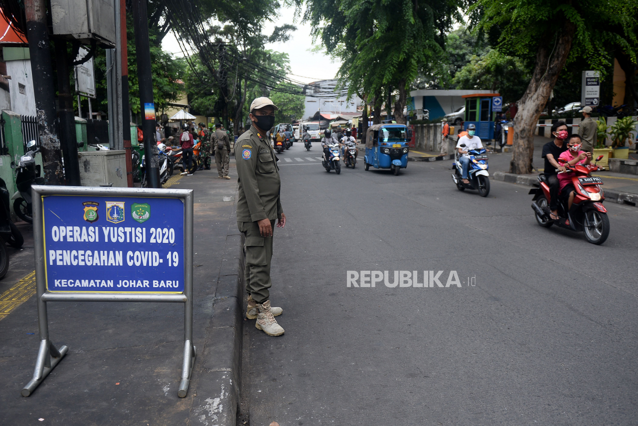 Petugas melakukan operasi yustisi protokol Covid-19 di Kawasan Johar Baru, Jakarta, Ahad (22/11). Dalam oprasi tersebut sebanyak 20 warga menjalani hukuman kerja sosial karena abai menggunakan masker | Prayogi/Republika