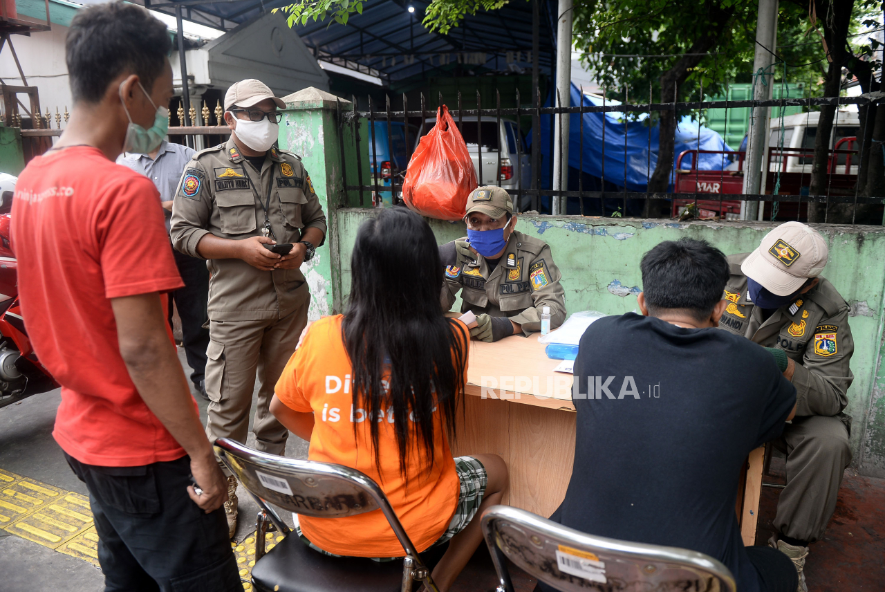 Petugas memproses warga yang terjaring operasi yustisi protokol Covid-19 di Kawasan Johar Baru, Jakarta, Ahad (22/11). Dalam oprasi tersebut sebanyak 20 warga menjalani hukuman kerja sosial karena abai menggunakan masker | Prayogi/Republika