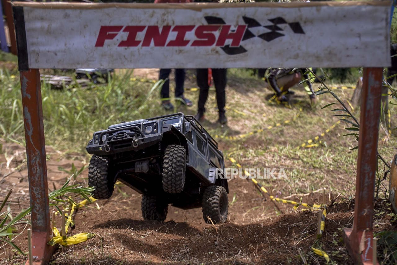 Mobil offroad remote control (RC) milik peserta berada di garis finis pada ajang Kejurda RC Adventure Jawa Barat Seri Final di Warung Langit, Cimenyan, Kabupaten Bandung, Ahad (20/12). Kejuaraan RC tersebut diikuti oleh 72 peserta yang berasal dari berbag | ABDAN SYAKURA/REPUBLIKA