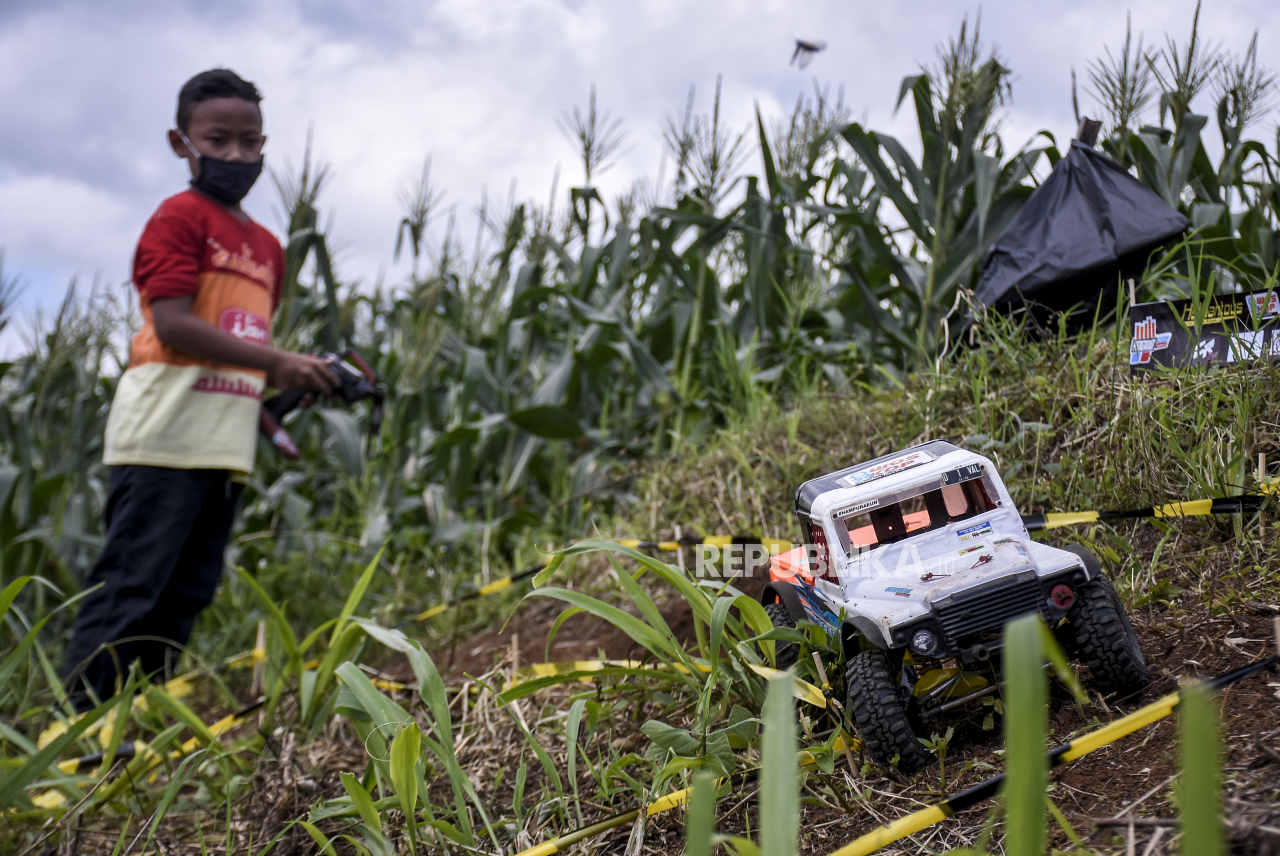 Peserta memainkan mobil offroad remote control (RC) pada ajang Kejurda RC Adventure Jawa Barat Seri Final di Warung Langit, Cimenyan, Kabupaten Bandung, Ahad (20/12). Kejuaraan RC tersebut diikuti oleh 72 peserta yang berasal dari berbagai daerah di Jawa | ABDAN SYAKURA/REPUBLIKA