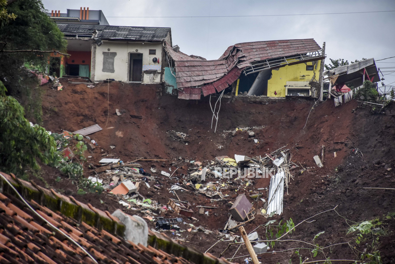 Sejumlah rumah rusak akibat tanah longsor di Desa Cihanjuang, Kecamatan Cimanggung, Kabupaten Sumedang, Ahad (10/1). Longsor yang disebabkan oleh kondisi tanah tidak stabil dan curah hujan tinggi pada Sabtu (9/1) mengakibatkan sekitar 14 rumah rusak berat | ABDAN SYAKURA/REPUBLIKA