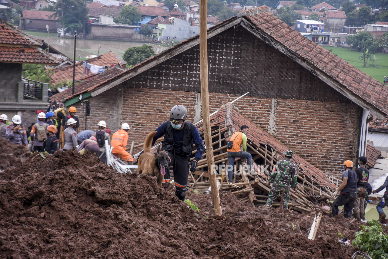 Petugas gabungan bersama anjing pelacak melakukan pencarian korban yang tertimbun tanah longsor di Desa Cihanjuang, Kecamatan Cimanggung, Kabupaten Sumedang, Ahad (10/1). Longsor yang disebabkan oleh kondisi tanah tidak stabil dan curah hujan tinggi pada | ABDAN SYAKURA/REPUBLIKA