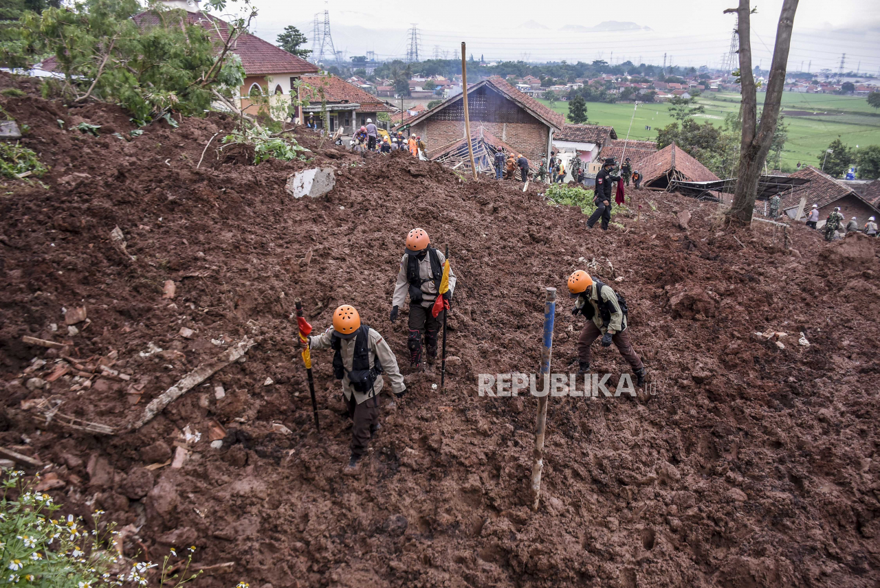 Petugas gabungan melakukan pencarian korban yang tertimbun tanah longsor di Desa Cihanjuang, Kecamatan Cimanggung, Kabupaten Sumedang, Ahad (10/1). Longsor yang disebabkan oleh kondisi tanah tidak stabil dan curah hujan tinggi pada Sabtu (9/1) mengakibatk | ABDAN SYAKURA/REPUBLIKA
