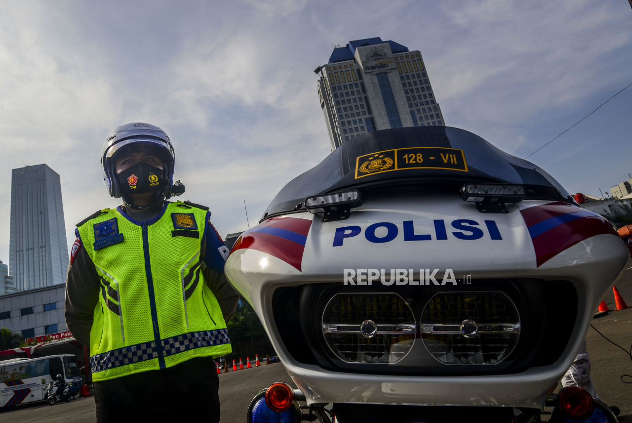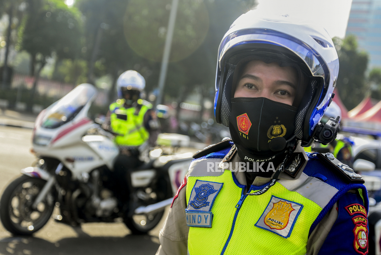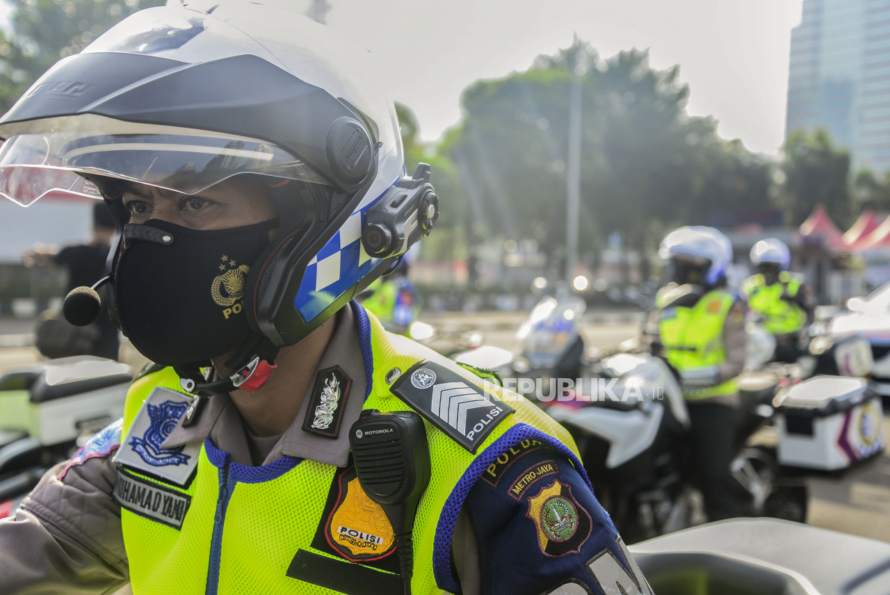 Anggota Kepolisian memakai helm yang dipasangkan kamera di Mapolda Metro Jaya, Jakarta, Sabtu (20/3). Polda Metro Jaya meluncurkan 30 unit kamera tilang elektronik atau Electronic Traffic Law Enforcment (ETLE) berbasis portable yang terdiri dari bodycam, | Republika/Putra M. Akbar
