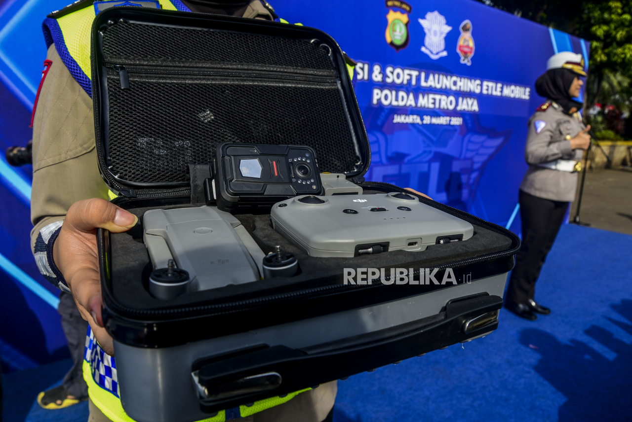 Anggota Kepolisian memperlihatkan peralatan Electronic Traffic Law Enforcment (ETLE) berbasis portable di Mapolda Metro Jaya, Jakarta, Sabtu (20/3). Polda Metro Jaya meluncurkan 30 unit kamera tilang elektronik atau ETLE berbasis portable yang terdiri dar | Republika/Putra M. Akbar