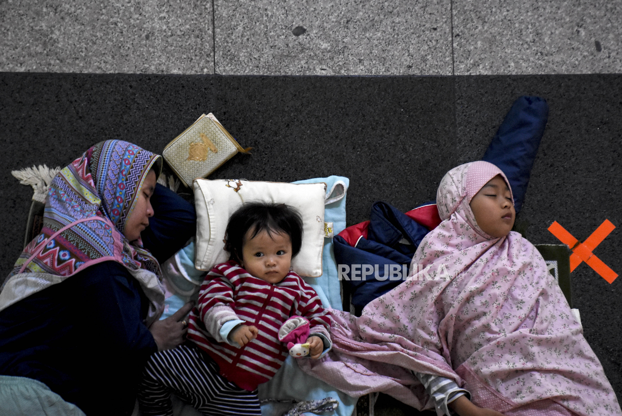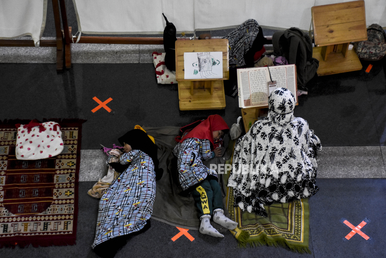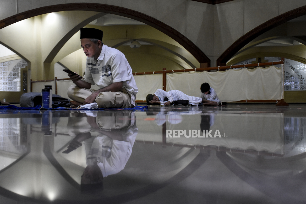 Umat muslim tertidur saat beritikaf pada sepuluh malam terakhir Ramadhan 1442 H di Masjid Pusdai, Kota Bandung, Senin (3/5) dini hari. Pada 10 hari menjelang berakhirnya bulan Ramadhan, umat muslim melakukan Itikaf untuk meraih malam kemuliaan (Lailatul Q | REPUBLIKA/ABDAN SYAKURA