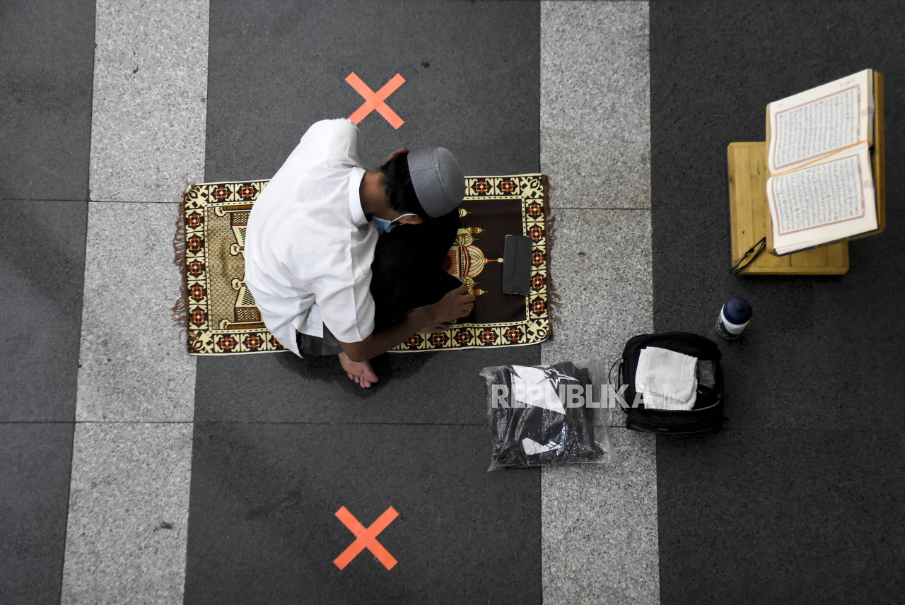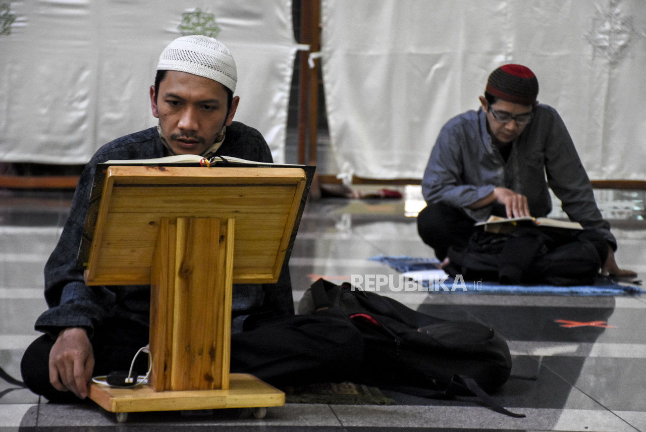 Umat muslim membaca Alquran saat beritikaf pada sepuluh malam terakhir Ramadhan 1442 H di Masjid Pusdai, Kota Bandung, Senin (3/5) dini hari. Pada 10 hari menjelang berakhirnya bulan Ramadhan, umat muslim melakukan Itikaf untuk meraih malam kemuliaan (Lai | REPUBLIKA/ABDAN SYAKURA