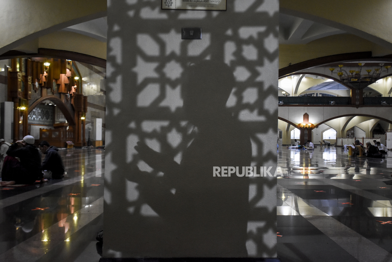 Umat muslim memanjatkan doa saat beritikaf pada sepuluh malam terakhir Ramadhan 1442 H di Masjid Pusdai, Kota Bandung, Senin (3/5) dini hari. Pada 10 hari menjelang berakhirnya bulan Ramadhan, umat muslim melakukan Itikaf untuk meraih malam kemuliaan (Lai | REPUBLIKA/ABDAN SYAKURA