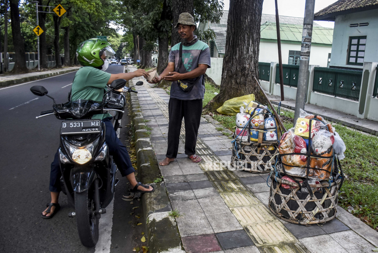 Pegiat sosial Ismaya Safitri memberikan nasi bungkus gratis ke sejumlah sopir saat kegiatan Gerakan Sosial Nasi Bungkus Dua Ribu di Jalan Brantas, Kota Bandung, Kamis (27/5). Gerakan sosial yang diinisiasi pegiat sosial Ismaya Safitri tersebut menyediakan | REPUBLIKA/ABDAN SYAKURA