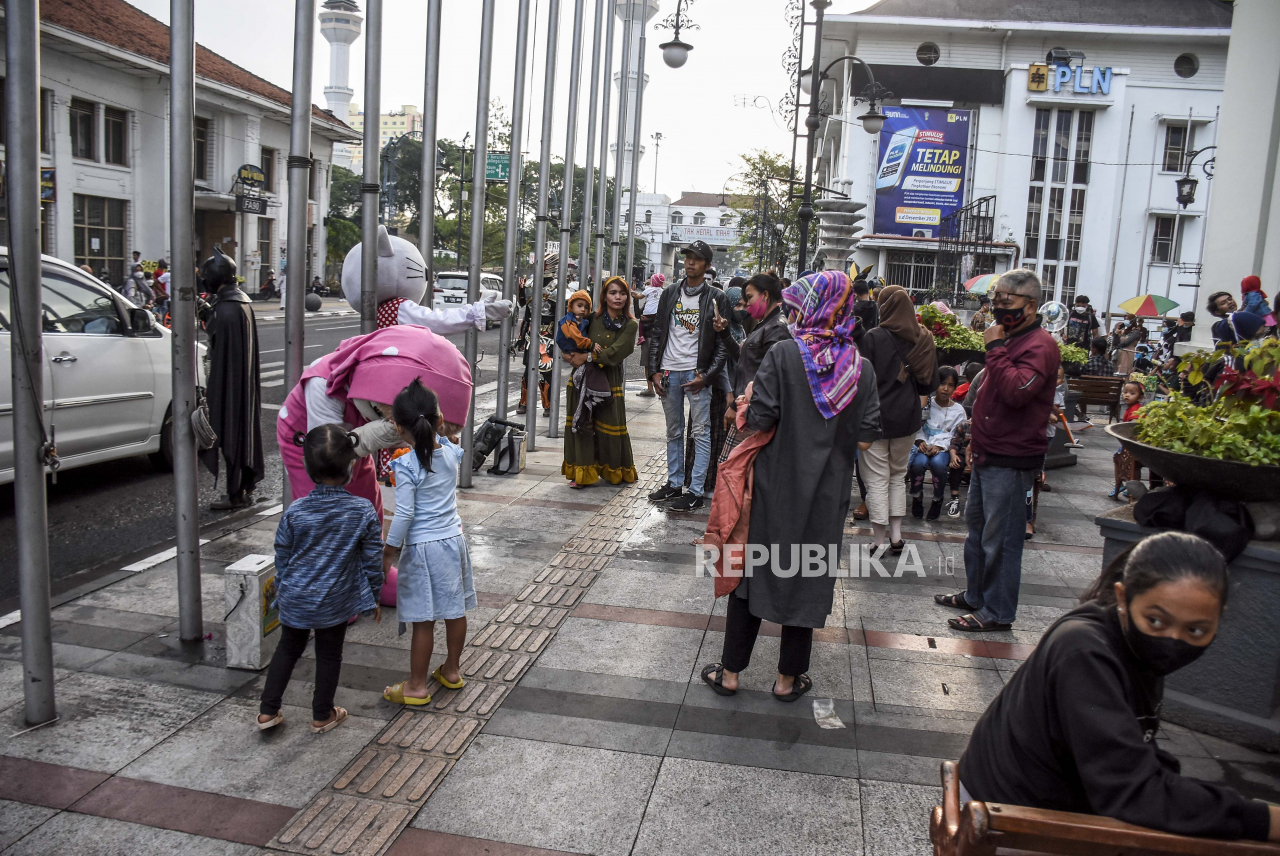 Sejumlah warga beraktivitas di kawasan Asia Afrika, Kota Bandung, Ahad (5/9). Kawasan wisata Asia Afrika mulai ramai dikunjungi pengunjung seiring dengan menurunnya level status Pemberlakuan Pembatasan Kegiatan Masyarakat (PPKM) di Kota Bandung yang menja | REPUBLIKA/ABDAN SYAKURA