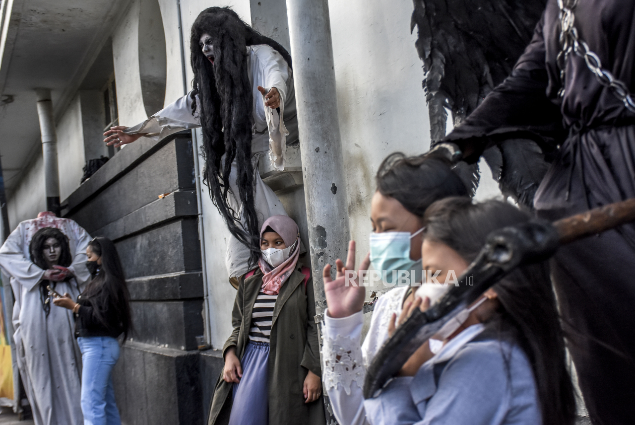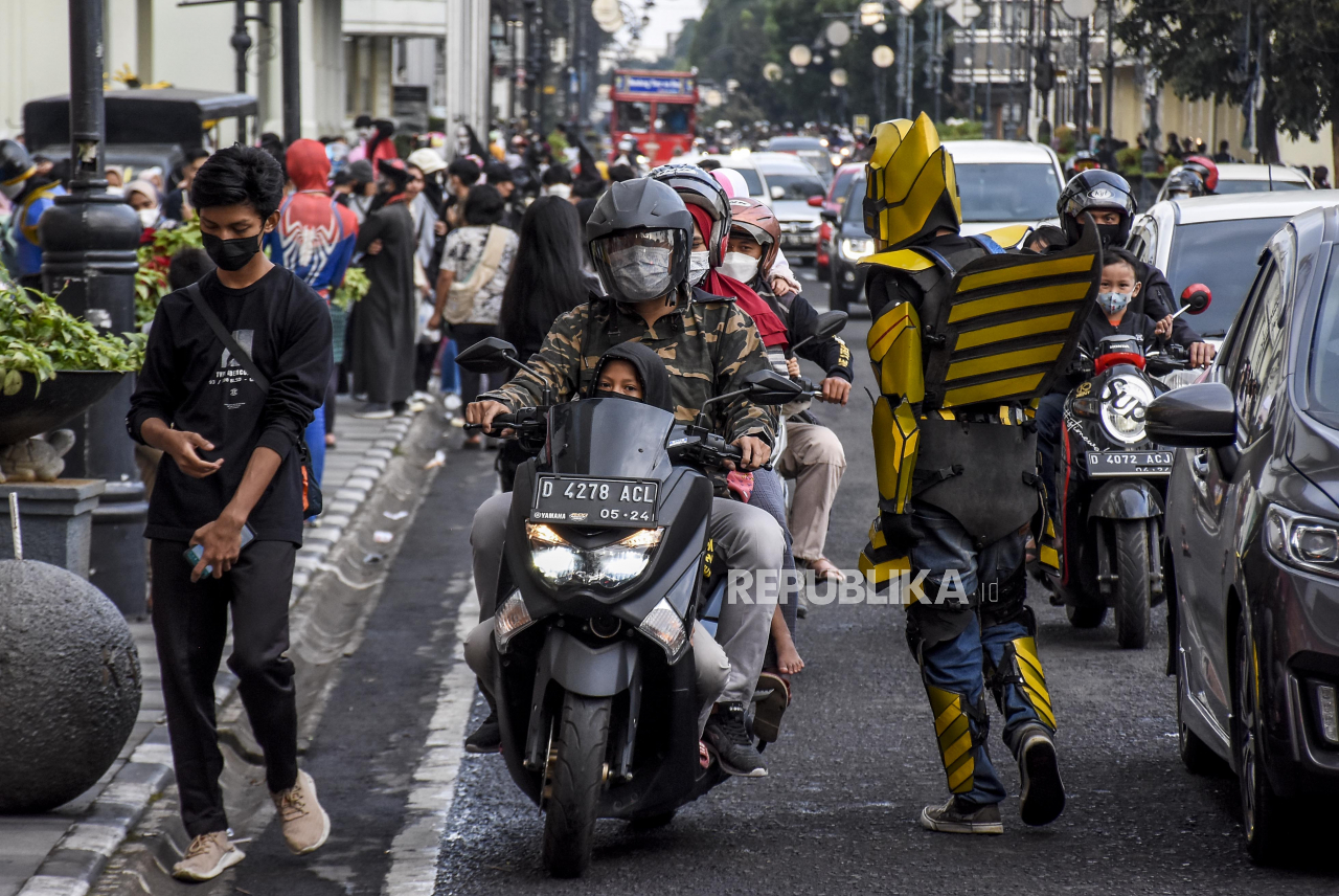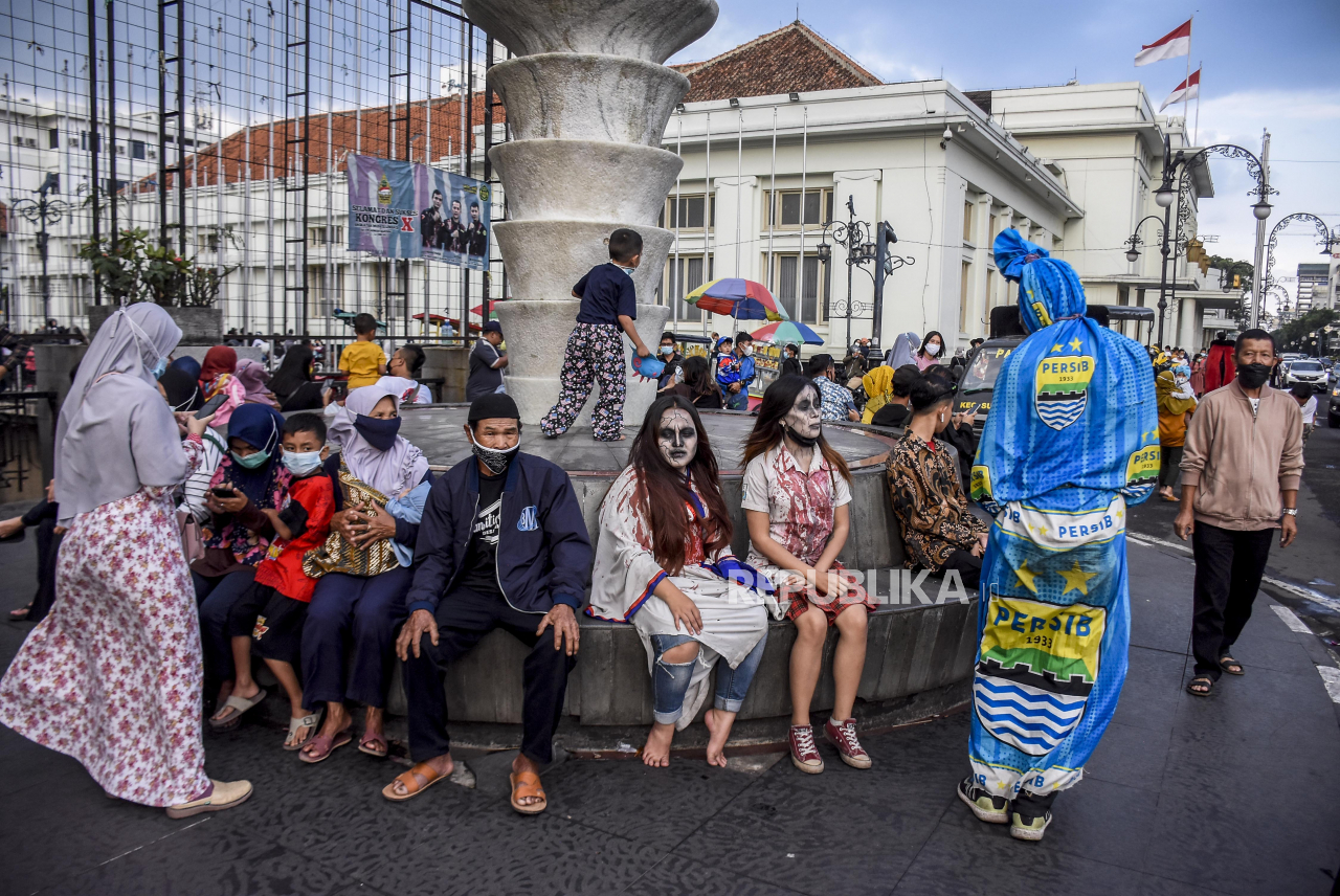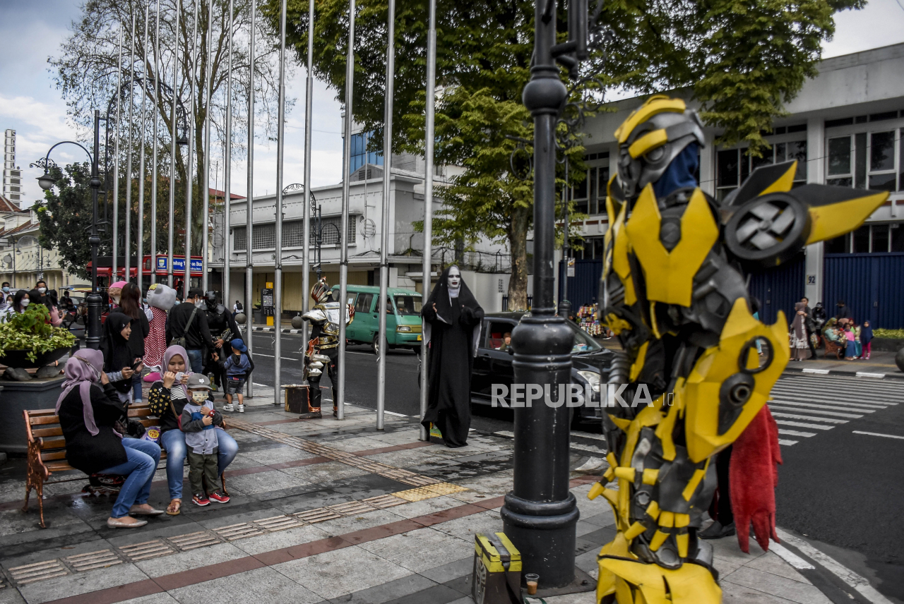 Sejumlah warga berfoto dengan cosplayer di kawasan Asia Afrika, Kota Bandung, Ahad (5/9). Kawasan wisata Asia Afrika mulai ramai dikunjungi pengunjung seiring dengan menurunnya level status Pemberlakuan Pembatasan Kegiatan Masyarakat (PPKM) di Kota Bandun | REPUBLIKA/ABDAN SYAKURA
