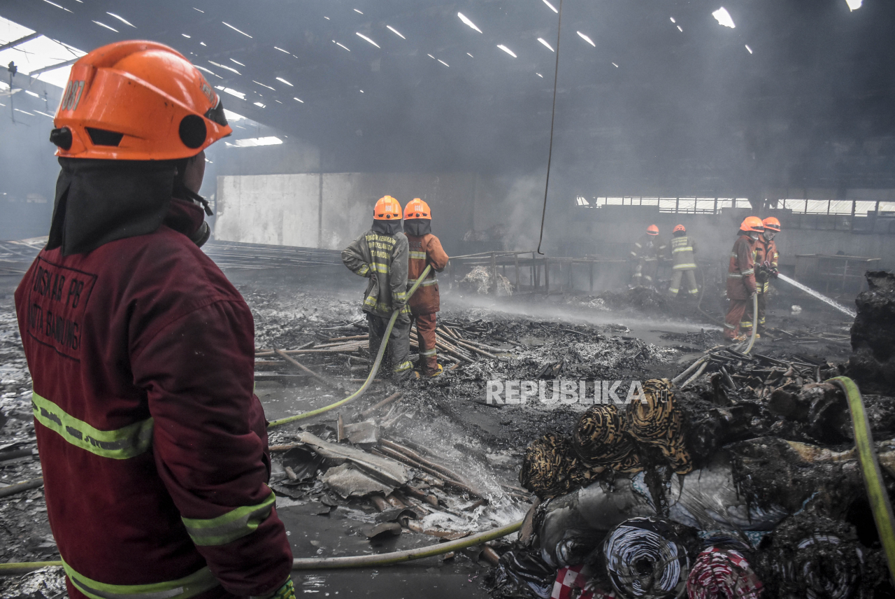 Petugas dari Dinas Kebakaran dan Penanggulangan Bencana (Diskar PB) Kota Bandung melakukan pendinginan di salah satu gudang penyimpanan pabrik tekstil yang terbakar di Jalan Jend Sudirman, Cijerah, Kota Bandung, Senin (4/10). Petugas menyatakan, kebakaran | REPUBLIKA/ABDAN SYAKURA