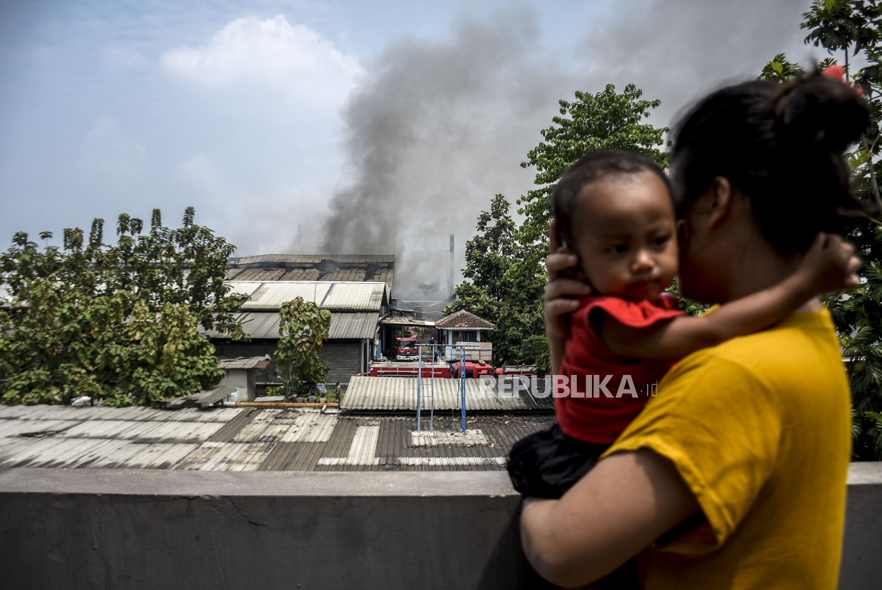 Warga melihat kepulan asap hitam akibat kebakaran salah satu gudang penyimpanan pabrik tekstil di Jalan Jend Sudirman, Cijerah, Kota Bandung, Senin (4/10). Petugas menyatakan, kebakaran tersebut diduga berasal dari tetesan oli panas yang menetes ke tumpuk | REPUBLIKA/ABDAN SYAKURA