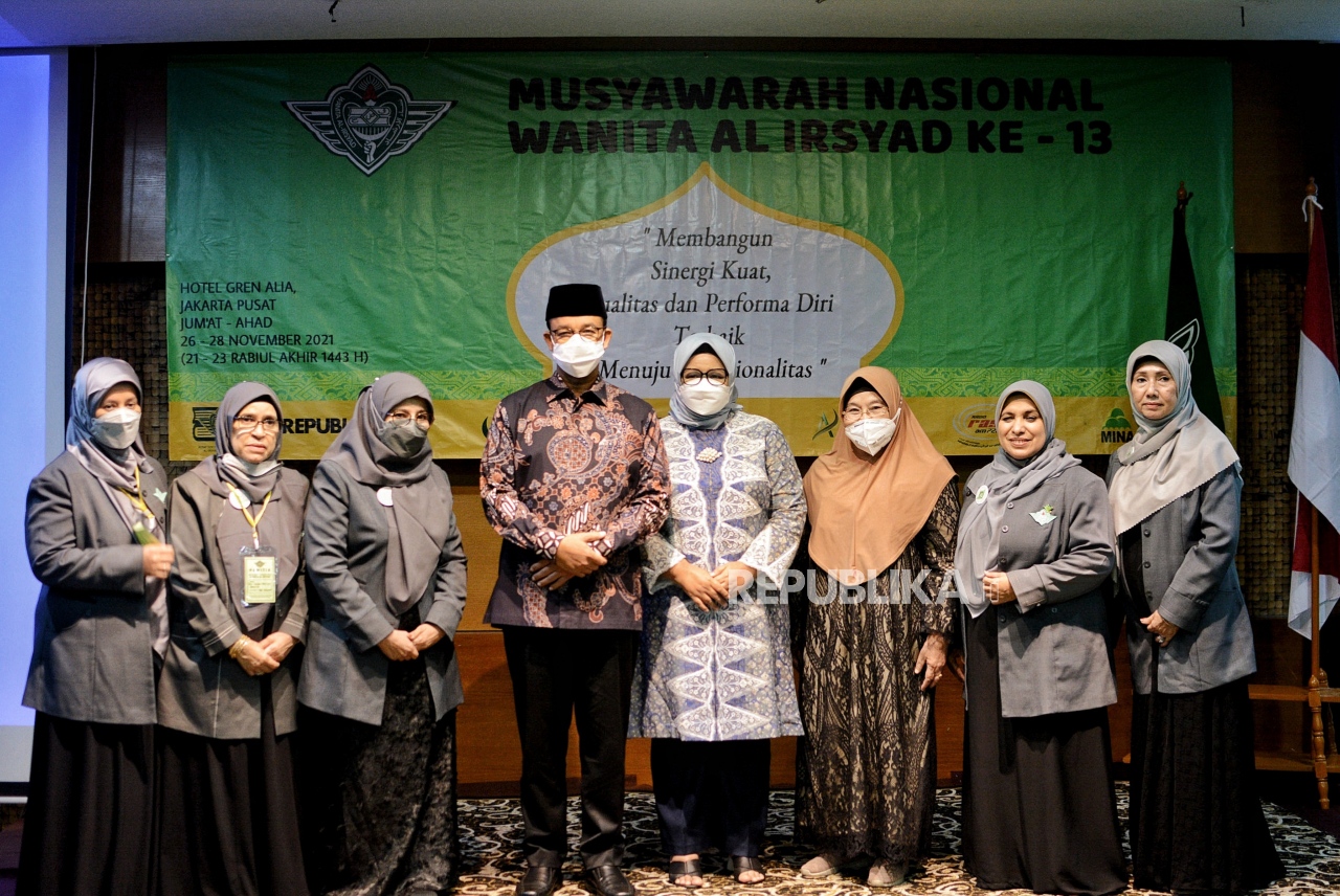Gubernur DKI Jakarta Anies Baswedan (keempat kiri) bersama istrinya Fery Farhati berfoto bersama jajaran pengurus Wanita Al-Irsyad usai membuka kegiatan Musyawarah Nasional ke-13 Wanita Al-Irsyad di Jakarta, Jumat (26/11). Musyawarah Nasional ke-13 Wanita | Republika/Thoudy Badai