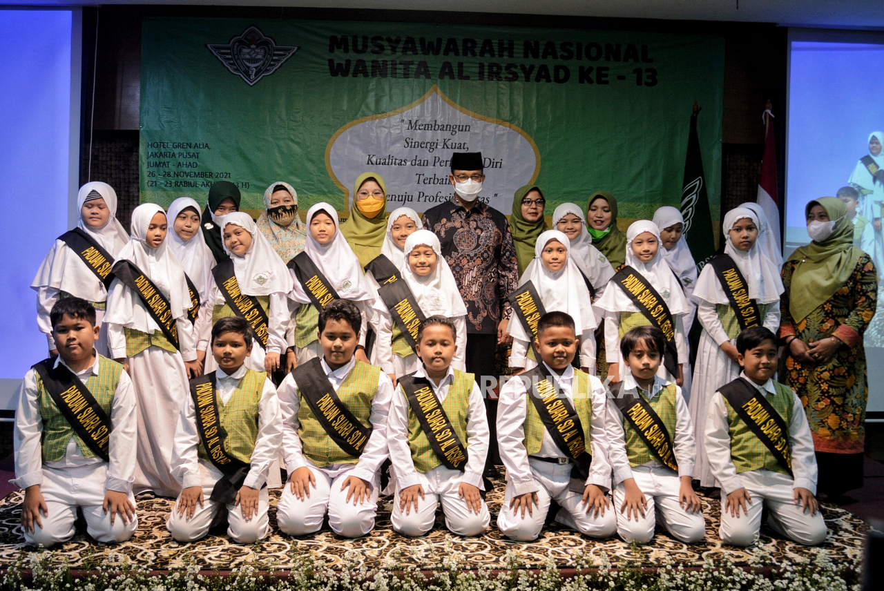 Gubernur DKI Jakarta Anies Baswedan berfoto bersama paduan suara SD Al-Irsyad saat membuka kegiatan Musyawarah Nasional ke-13 Wanita Al-Irsyad di Jakarta, Jumat (26/11). Musyawarah Nasional ke-13 Wanita Al-Irsyad tersebut mengangkat tema Membangun Sinerg | Republika/Thoudy Badai