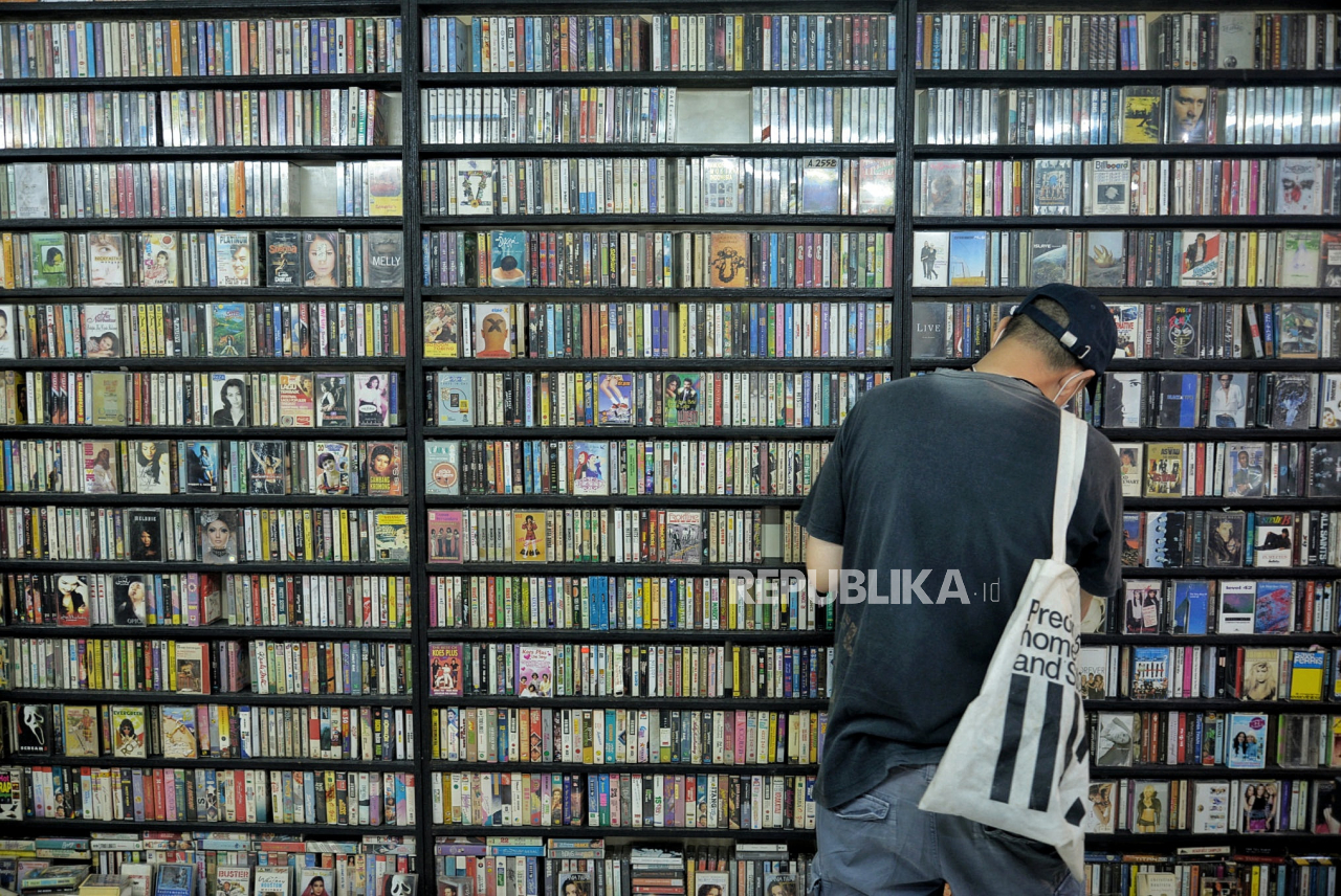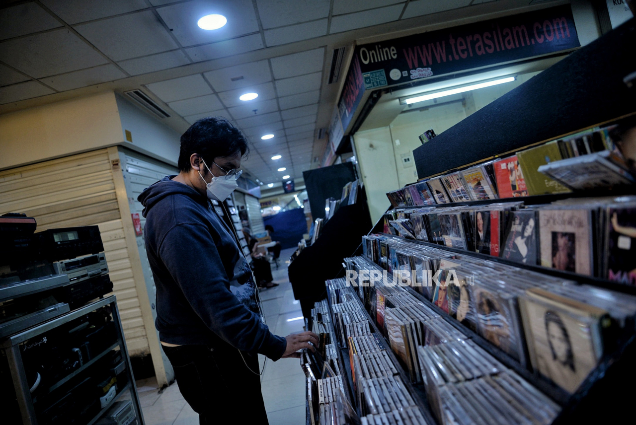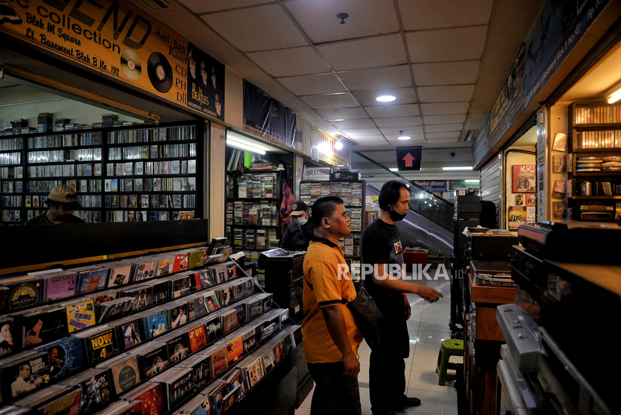 Pengunjung memilih rilisan musik fisik di Pasar Musik Blok M Square, Jakarta Selatan, Ahad (9/1). Di tengah geliat industri musik digital, Pasar Musik Blok M Square tetap menawarkan berbagai rilisan fisik musik seperti kaset pita, CD, vinyl dengan harga v | Republika/Thoudy Badai