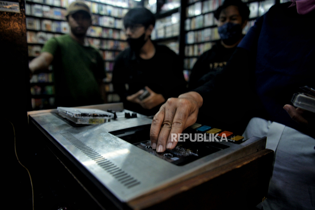 Pengunjung mencoba kaset pita sebelum dibeli di Pasar Musik Blok M Square, Jakarta Selatan, Ahad (9/1). Di tengah geliat industri musik digital, Pasar Musik Blok M Square tetap menawarkan berbagai rilisan fisik musik seperti kaset pita, CD, vinyl dengan h | Republika/Thoudy Badai