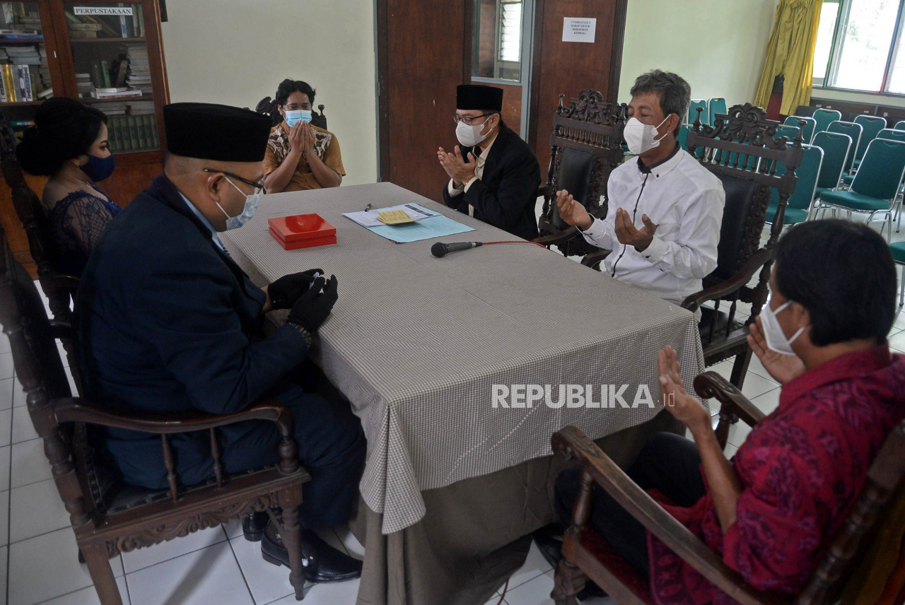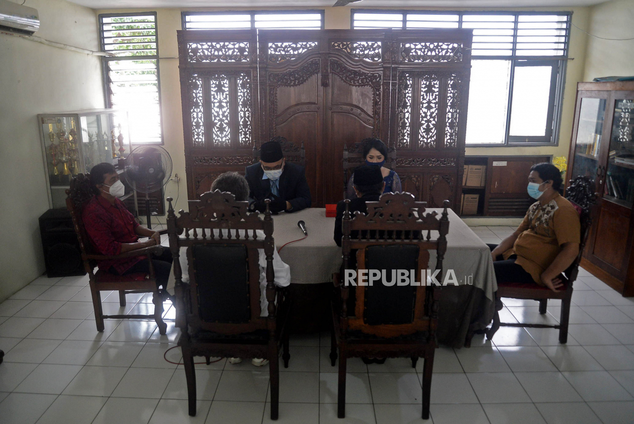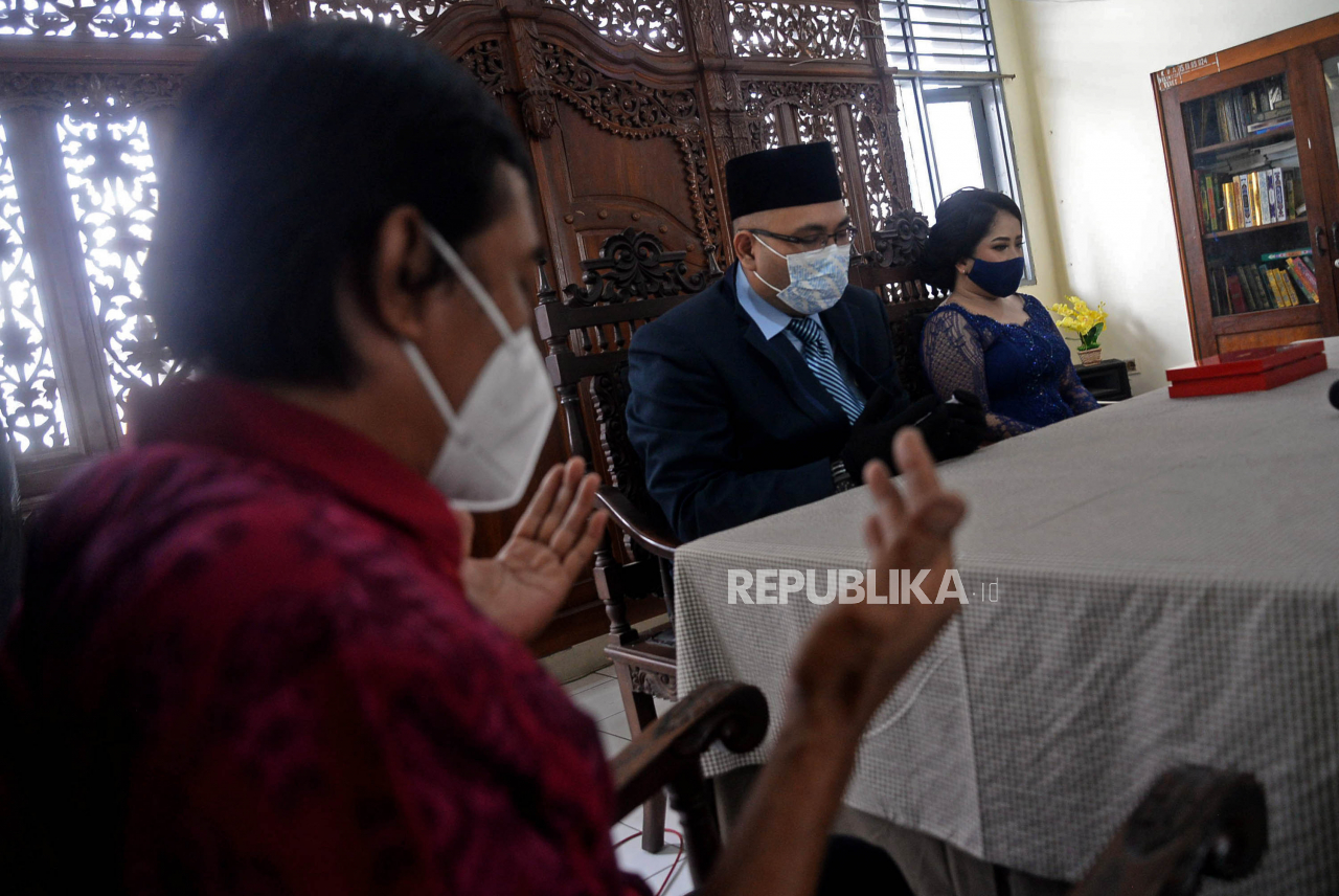 Pasangan melangsungkan pernikahannya di KUA Tebet, Jakarta, Selasa (22/02/2022). Sejumlah pasangan sengaja melangsungkan pernikahannya pada hari ini yang memiliki tanggal, bulan dan tahun yang unik yakni 22-02-2022.Prayogi/Republika | Prayogi/Republika