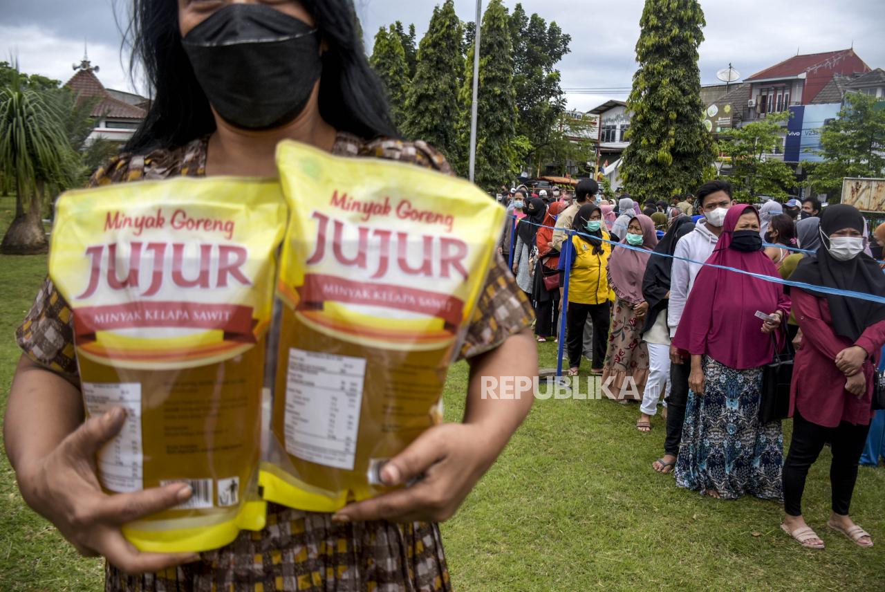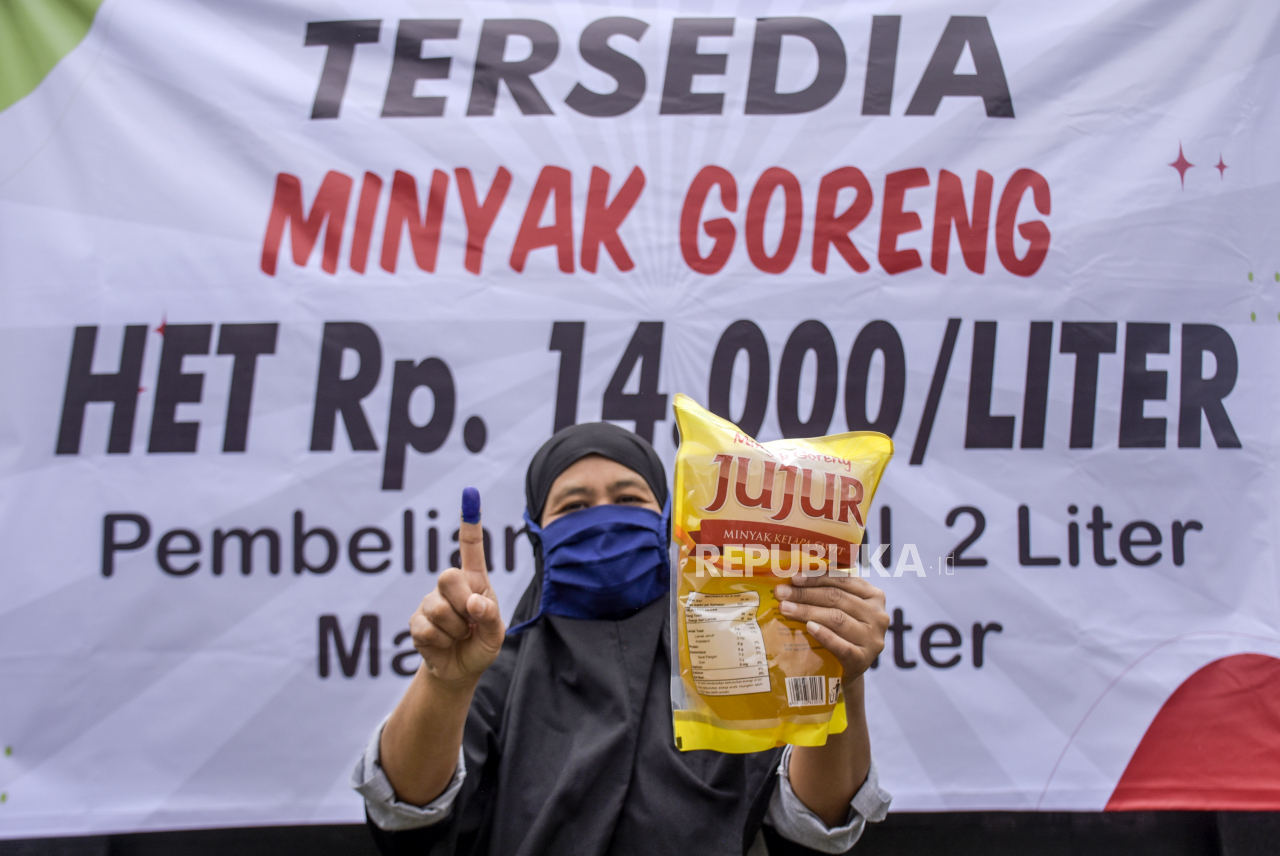 Warga menunjukkan minyak goreng saat operasi pasar minyak goreng di Kantor Bulog Cabang Bandung, Jalan Cipamokolan, Kota Bandung, Kamis (24/2/2022). Pemerintah Kota Bandung melalui Dinas Perdagangan dan Perindustrian (Disdagin) Kota Bandung bersama Perum | REPUBLIKA/ABDAN SYAKURA