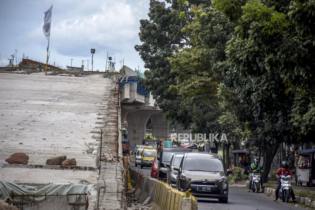 Kendaraan melintas di samping area pembangunan Jembatan Layang (flyover) Kopo di Jalan Soekarno Hatta, Kota Bandung, Jumat (25/2/2022). Pemerintah Kota Bandung menyatakan pembangunan Flyover Kopo tersebut telah mencapai 80 persen dan ditargetkan rampung p | REPUBLIKA/ABDAN SYAKURA