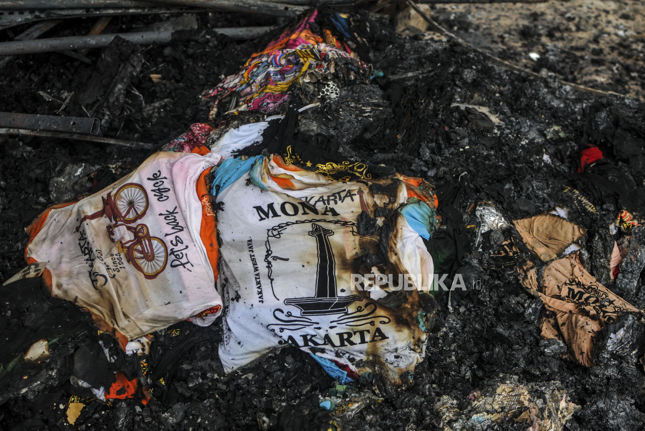 Sejumlah baju dagangan yang telah terbakar di kawasan Monas, Jakarta, Kamis (31/3/2022). Sebanyak 172 kios lenggang Jakarta terbakar yang diduga akibat korsleting listrik dengan kerugian diperkirakan mencapai Rp 1,2 miliar. Republika/Putra M. Akbar | Republika/Putra M. Akbar