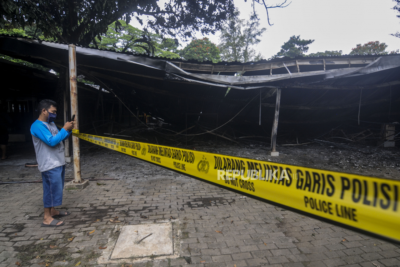 Pedagang memotret kondisi puing-puing kios pasca kebakaran di kawasan Monas, Jakarta, Kamis (31/3/2022). Sebanyak 172 kios lenggang Jakarta terbakar yang diduga akibat korsleting listrik dengan kerugian diperkirakan mencapai Rp 1,2 miliar. Republika/Putra | Republika/Putra M. Akbar