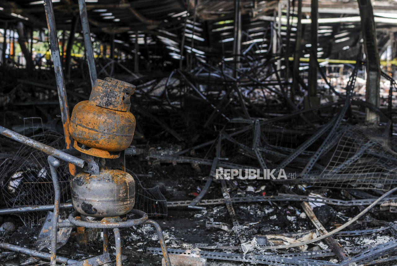 Tabung gas yang hangus terbakar di kawasan Monas, Jakarta, Kamis (31/3/2022). Sebanyak 172 kios lenggang Jakarta terbakar yang diduga akibat korsleting listrik dengan kerugian diperkirakan mencapai Rp 1,2 miliar. Republika/Putra M. Akbar | Republika/Putra M. Akbar