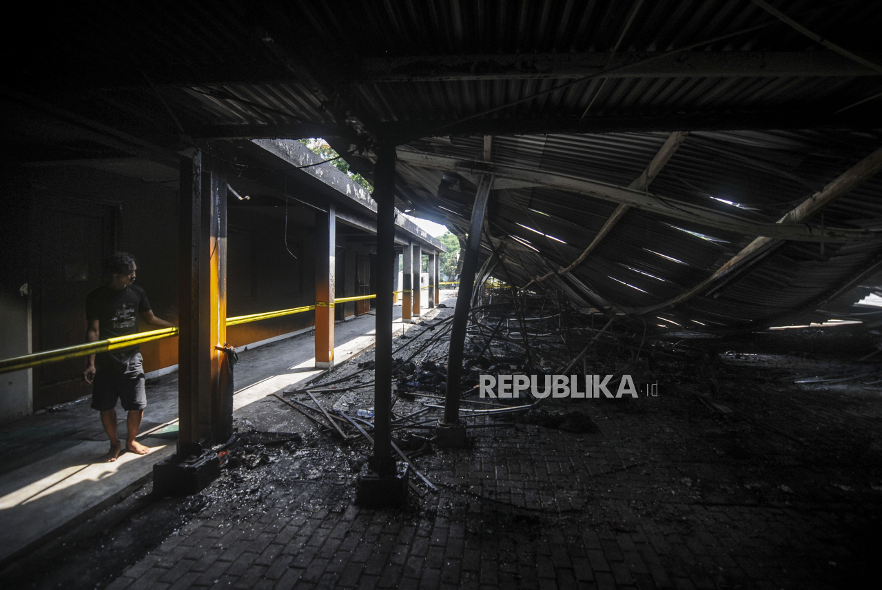 Pedagang melihat kondisi puing-puing kios pasca kebakaran di kawasan Monas, Jakarta, Kamis (31/3/2022). Sebanyak 172 kios lenggang Jakarta terbakar yang diduga akibat korsleting listrik dengan kerugian diperkirakan mencapai Rp 1,2 miliar. Republika/Putra | Republika/Putra M. Akbar