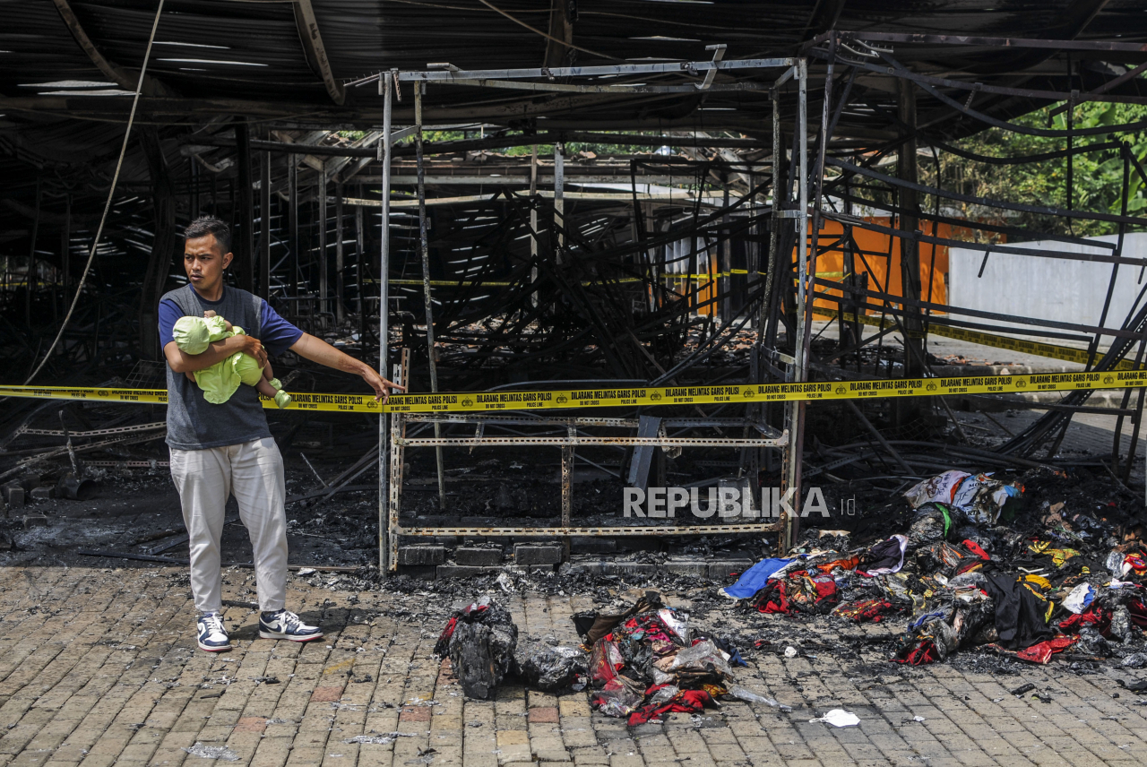 Pedagang melihat baju dagangan yang telah terbakar di kawasan Monas, Jakarta, Kamis (31/3/2022). Sebanyak 172 kios lenggang Jakarta terbakar yang diduga akibat korsleting listrik dengan kerugian diperkirakan mencapai Rp 1,2 miliar. Republika/Putra M. Akba | Republika/Putra M. Akbar