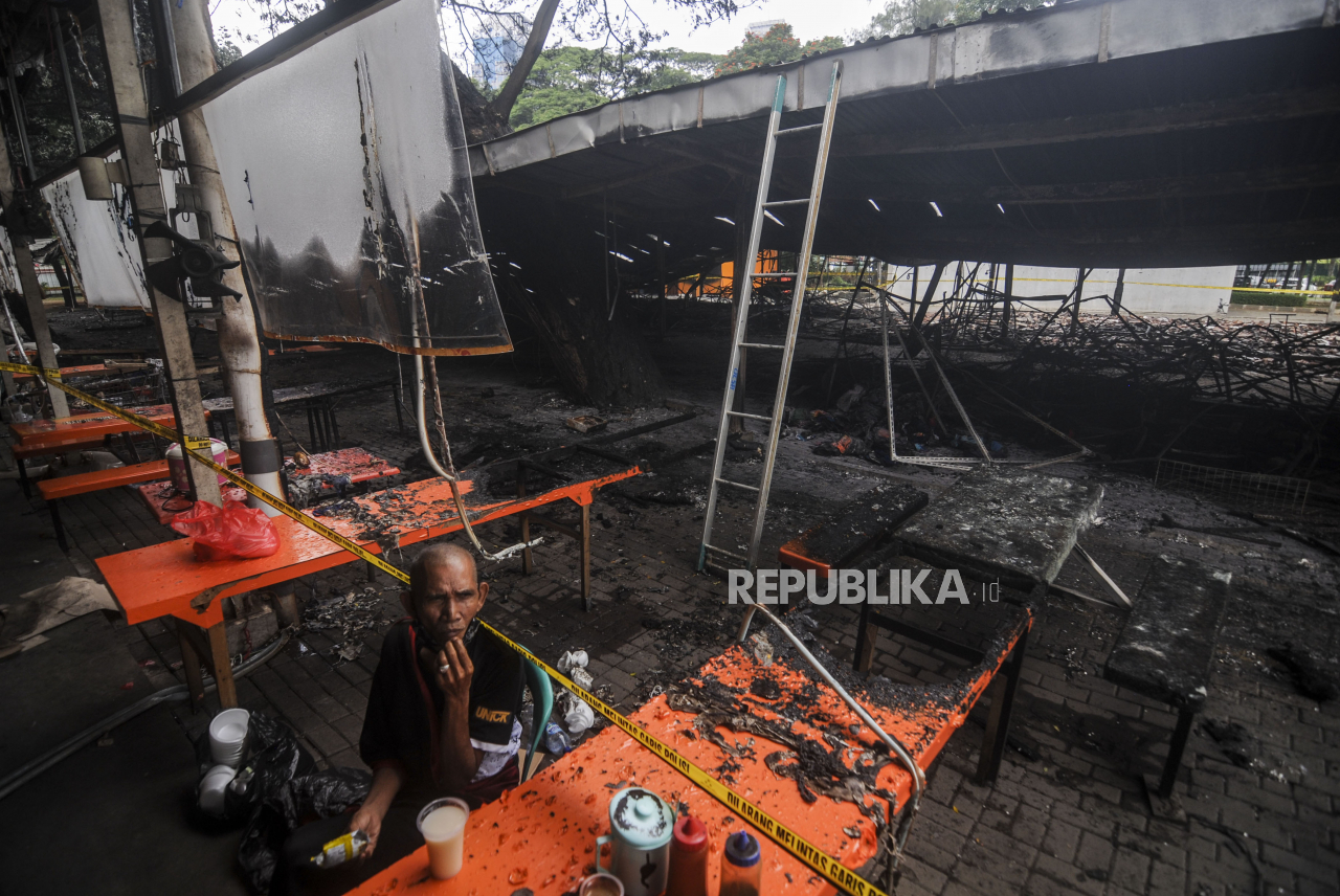 Pedagang duduk di dekat puing-puing kios pasca kebakaran di kawasan Monas, Jakarta, Kamis (31/3/2022). Sebanyak 172 kios lenggang Jakarta terbakar yang diduga akibat korsleting listrik dengan kerugian diperkirakan mencapai Rp 1,2 miliar. Republika/Putra M | Republika/Putra M. Akbar