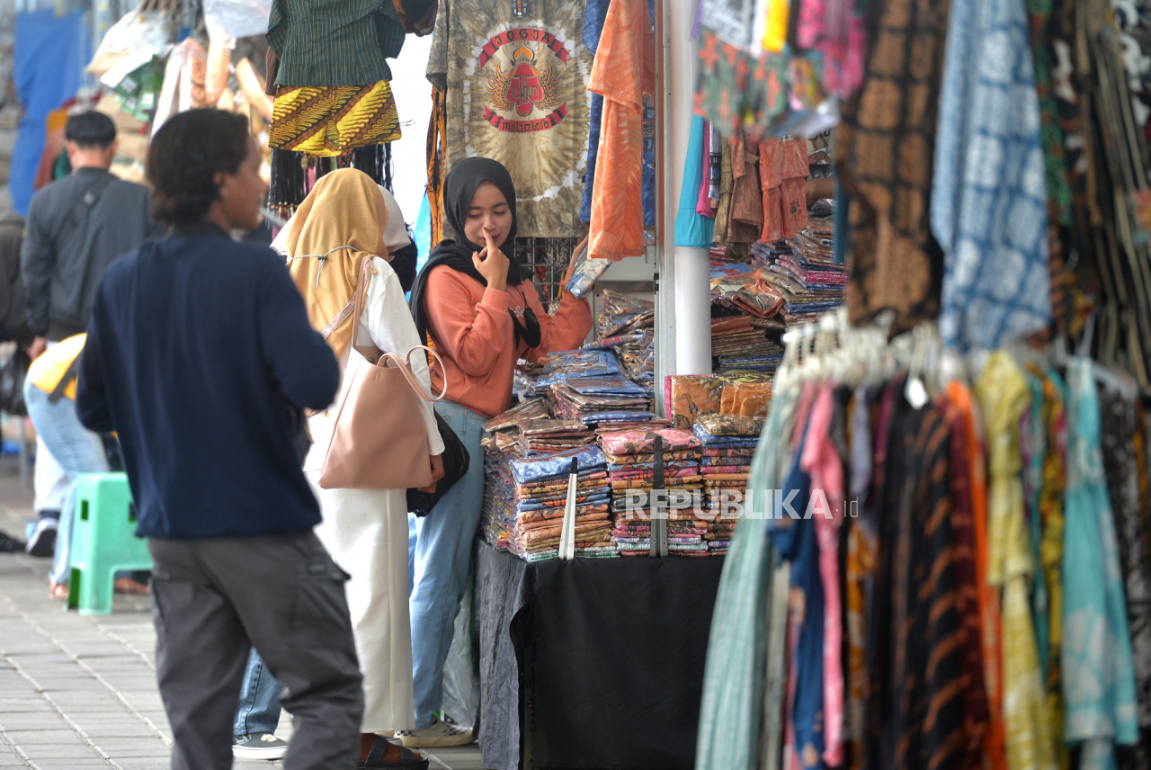 Wisatawan membeli cenderamata di Teras Malioboro 2, Yogyakarta, Kamis (26/5/2022). Libur nasional membawa berkah bagi pedagang cenderamata di Teras Malioboro 2. Sejak menjelang siang wisatawan mulai ramai untuk membeli Anke cenderamata khas Yogyakarta. Se | Wihdan Hidayat / Republika